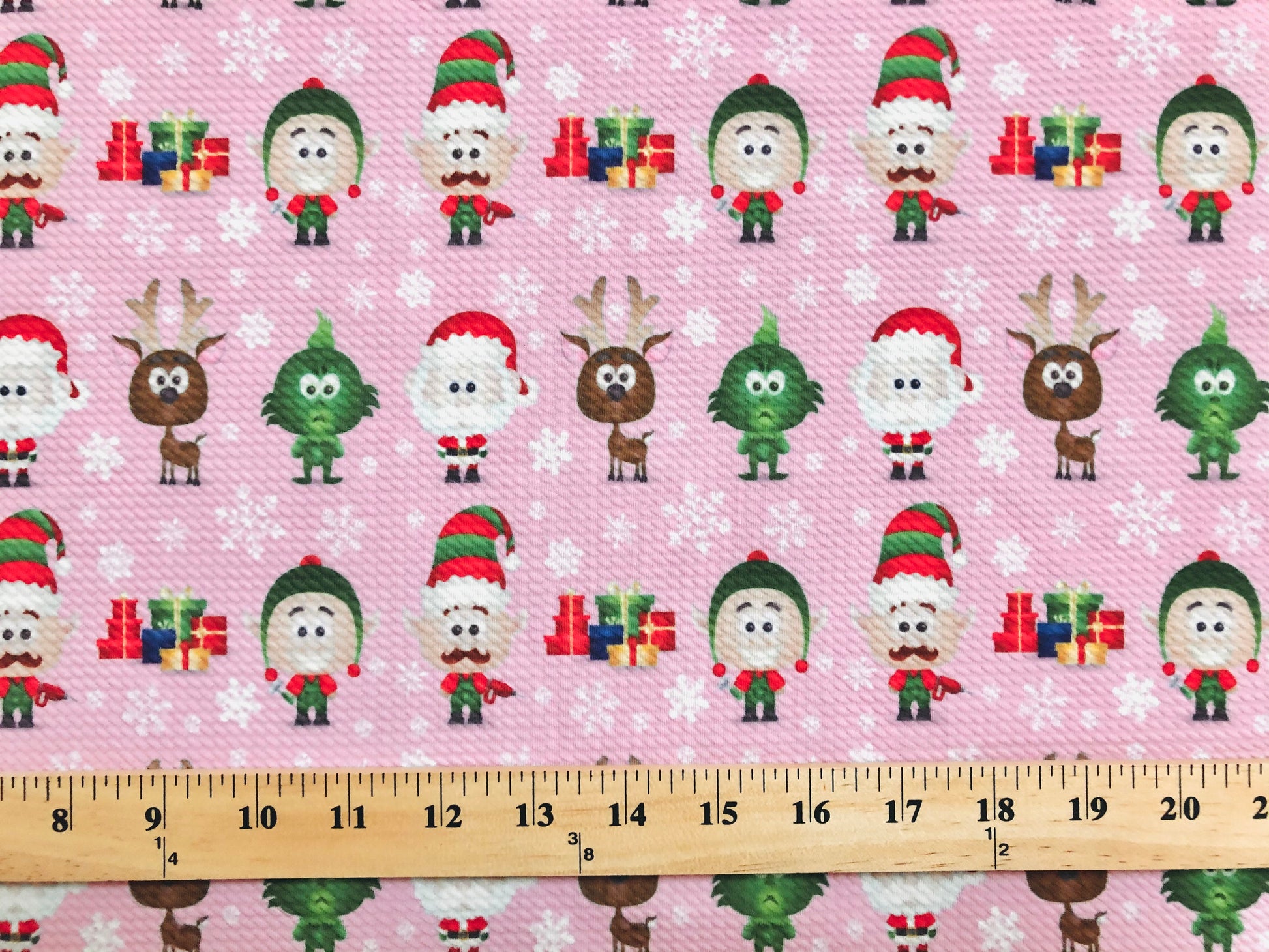 Premium Bullet Knit Christmas Holiday Fabric – Pink Cartoon Santa, Elves & Reindeer Print, 56″ Wide, Sold by the Yard (BPR193)