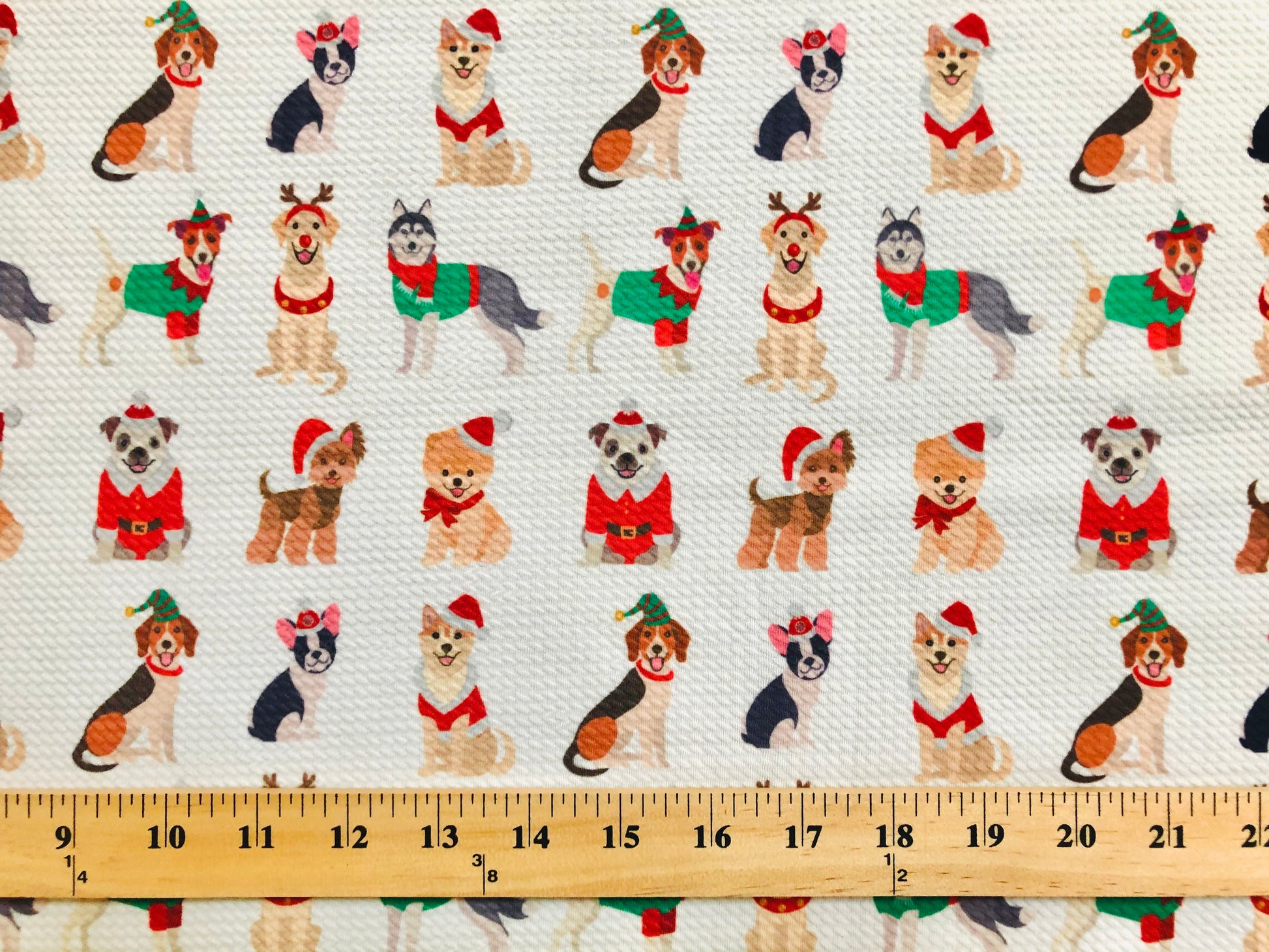 Bring bold holiday spirit to your projects with our Premium Bullet Knit Fabric – Festive Pups in Santa, Reindeer & Elf Costumes on Ivory, featuring playful pups decked out as Santa, reindeer, and elves against a striking ivory canvas. This premium 4-way stretch double knit delivers unbeatable softness and flexibility, while its vivid, fade-resistant dye-sublimation prints ensure your festive designs stand out with lasting impact.