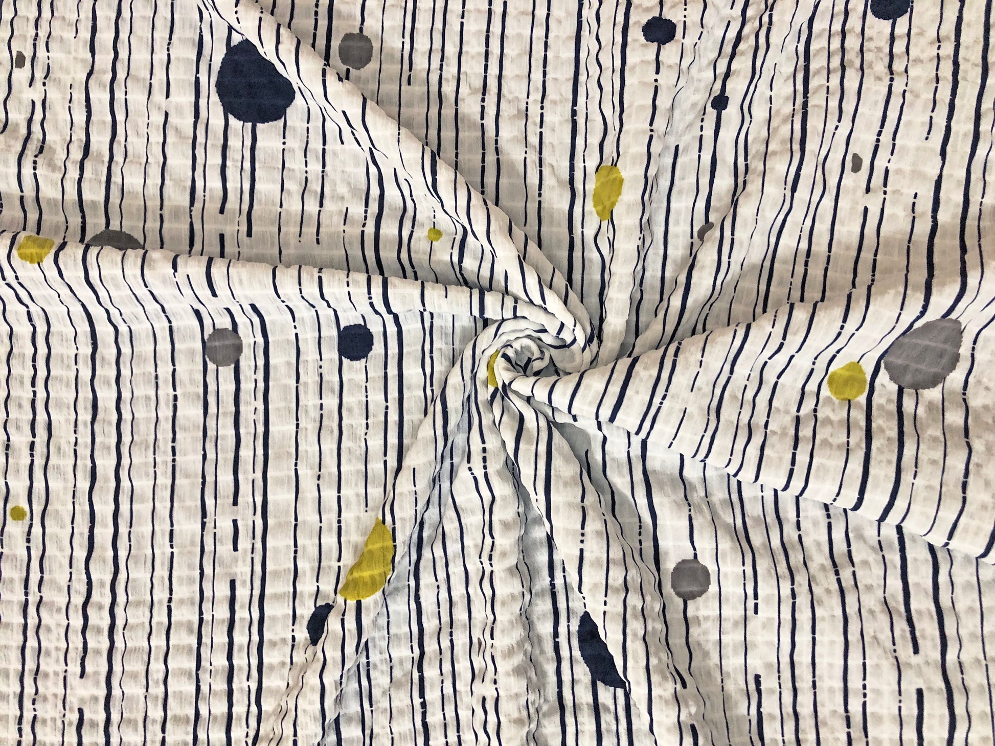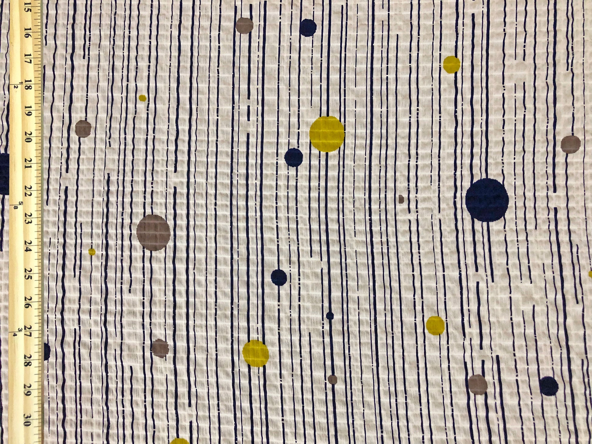 Breezy, modern, and ready to wear—this Poly Dobby Seersucker brings a cool, breathable crinkle with a crisp navy pin-stripe and playful dots. The wrinkle-masking texture and easy-care finish make summer shirts, dresses, and décor effortless.