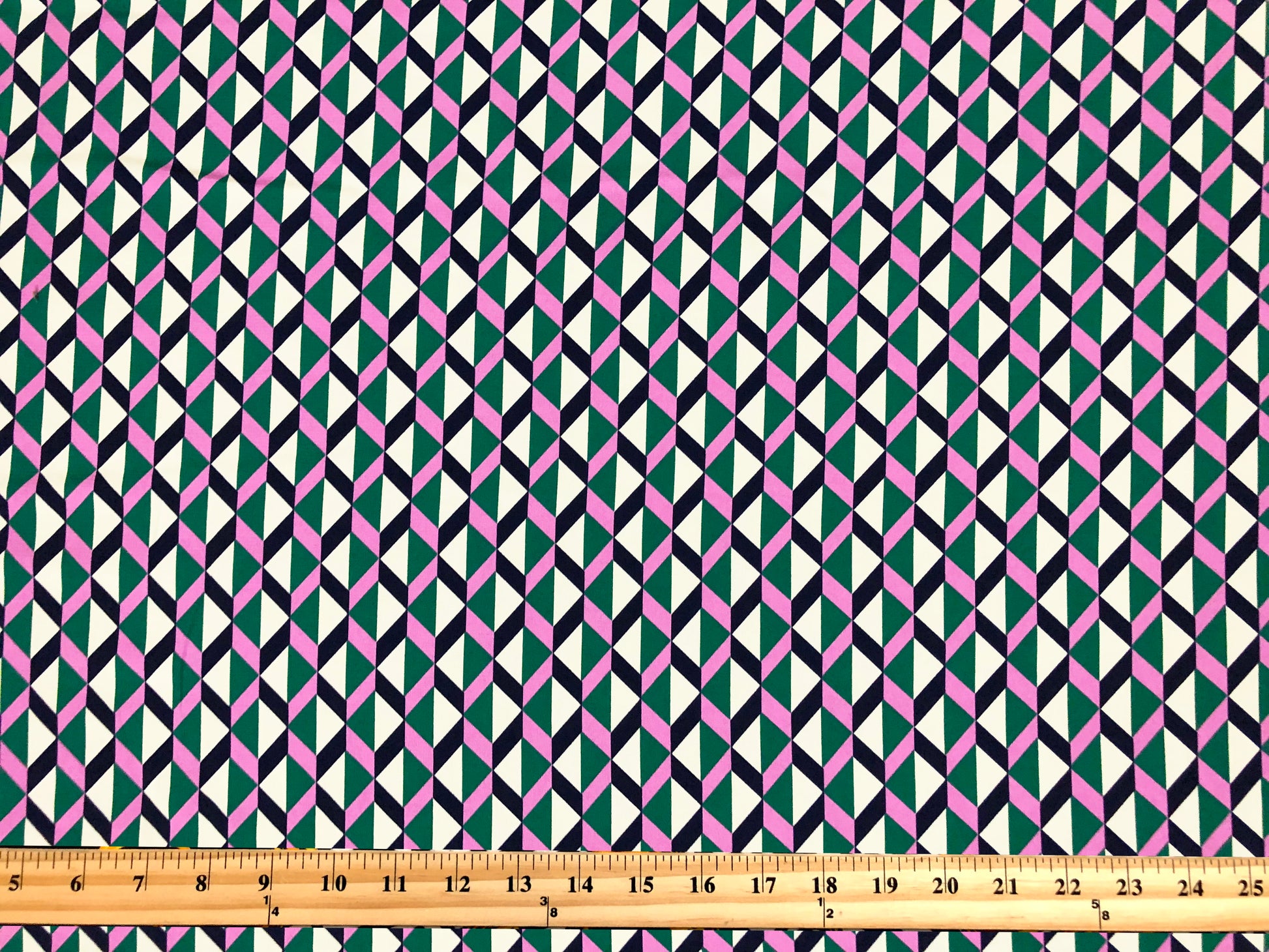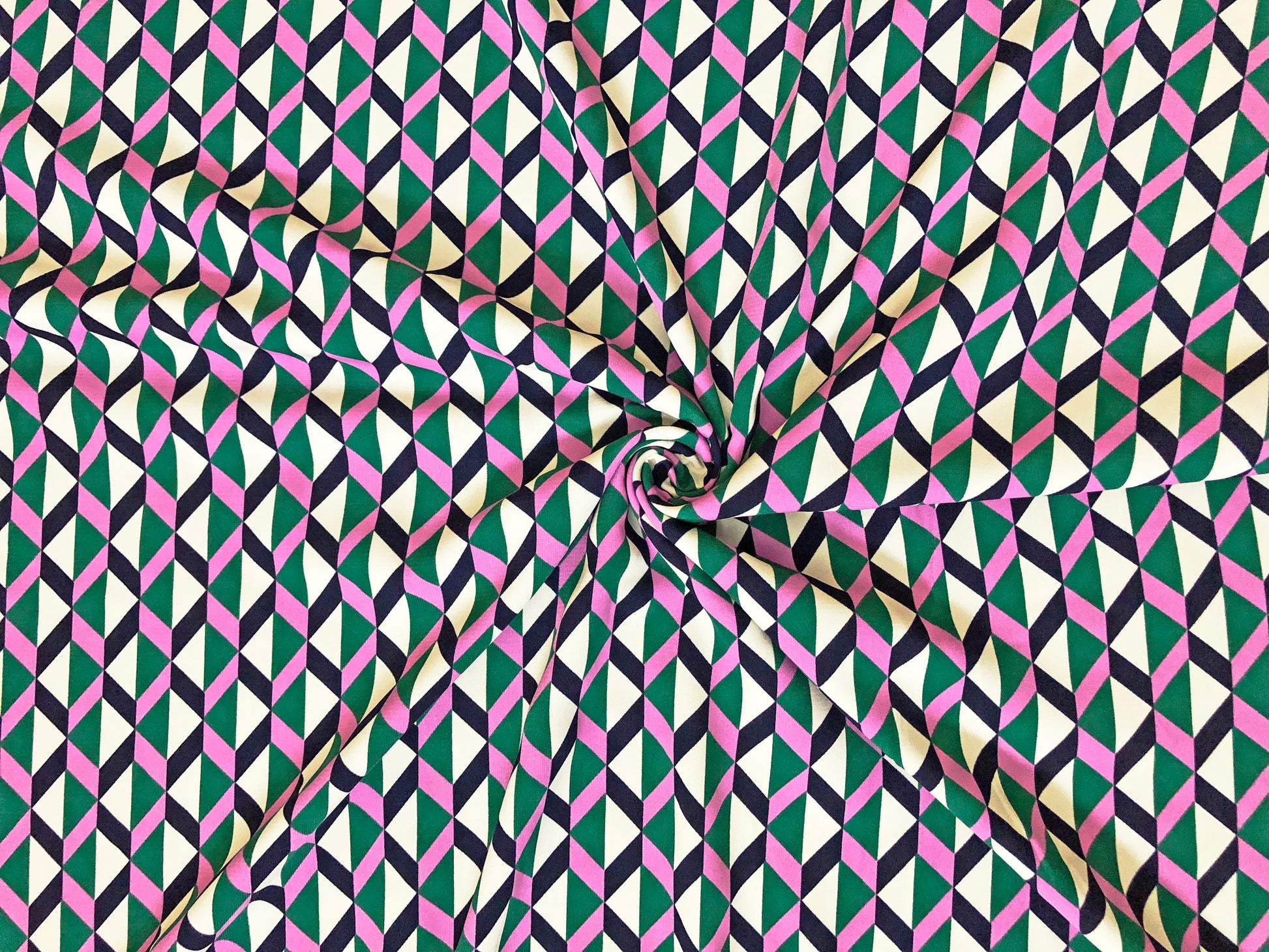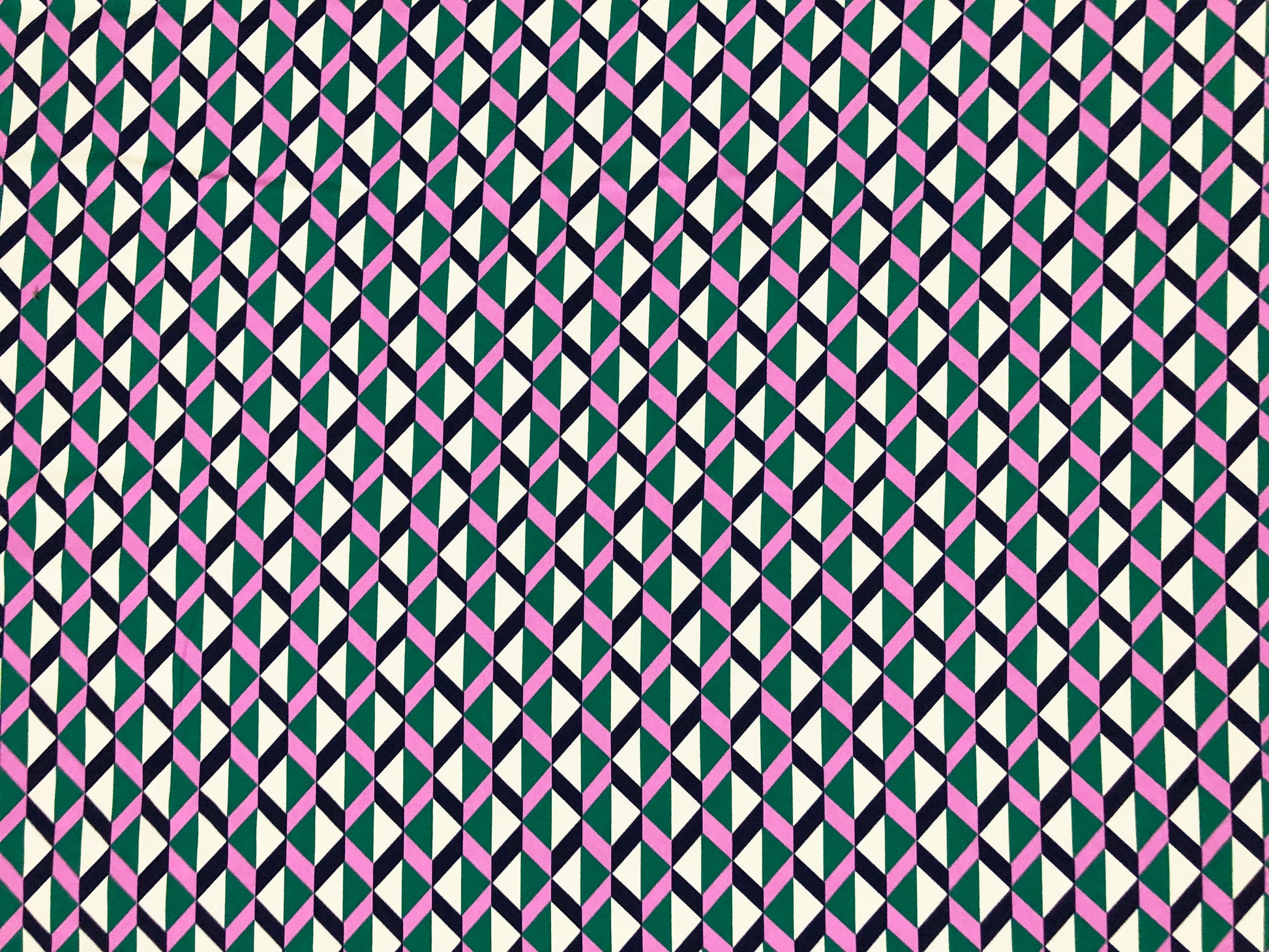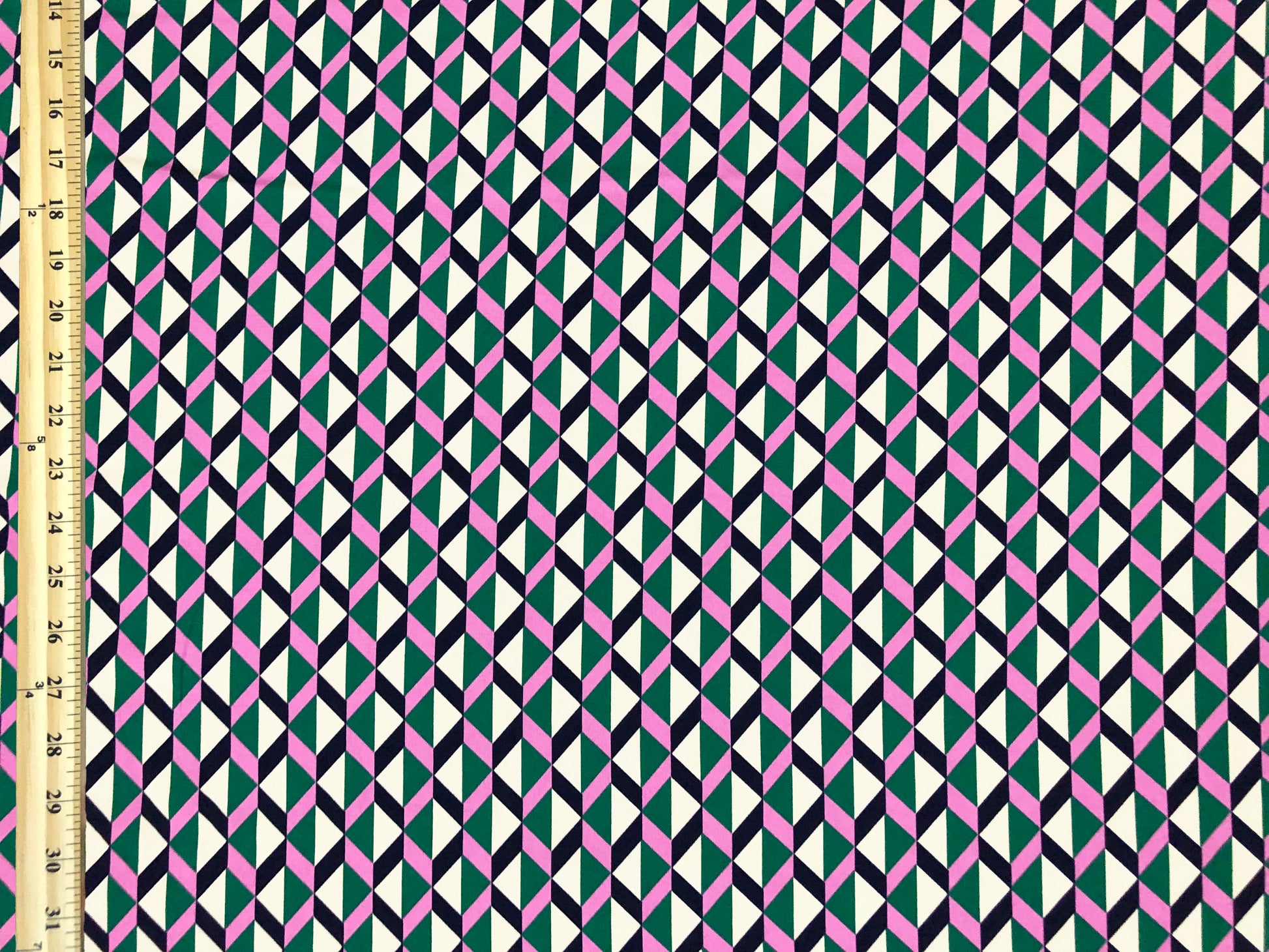 Make a bold move. This fabric flows with airy drape and a soft matte hand. A graphic pink-and-emerald lattice on black/ivory is retro-chic and modern—ideal for statement dresses, swingy blouses and scarf-worthy accents.