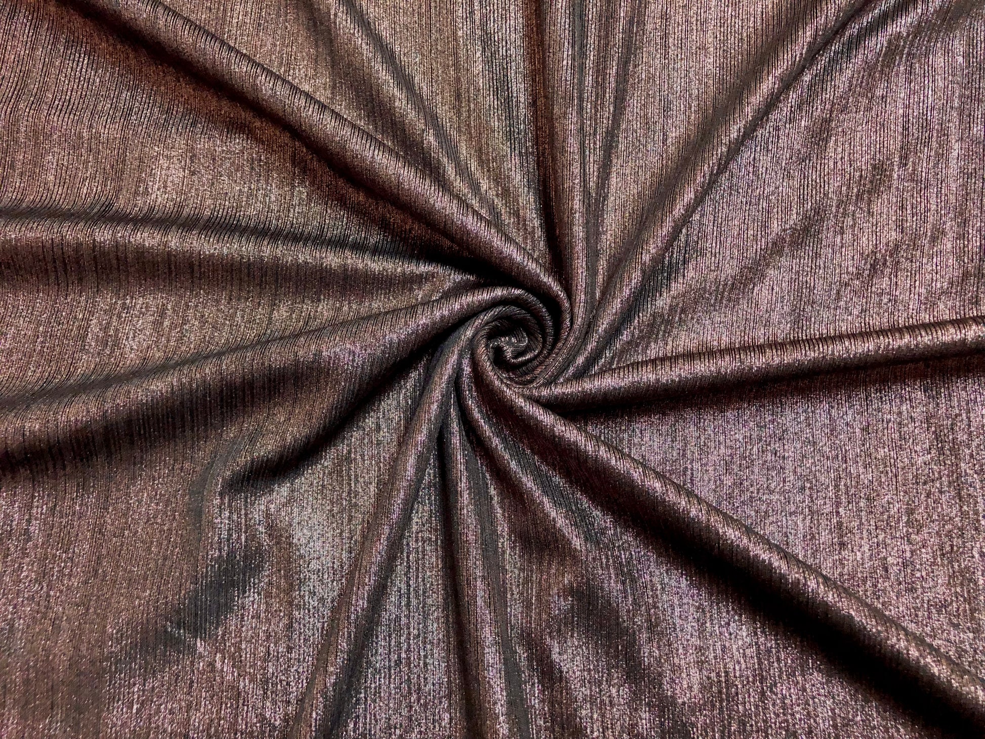 Add bold texture and luminous flair to your projects with this Rose Gold Shimmer Rib Knit Fabric! Featuring a soft vertical rib pattern with a metallic-like sheen, this 4-way stretch fabric is ideal for statement pieces like bodycon dresses, dancewear, cosplay outfits, tops, and more.