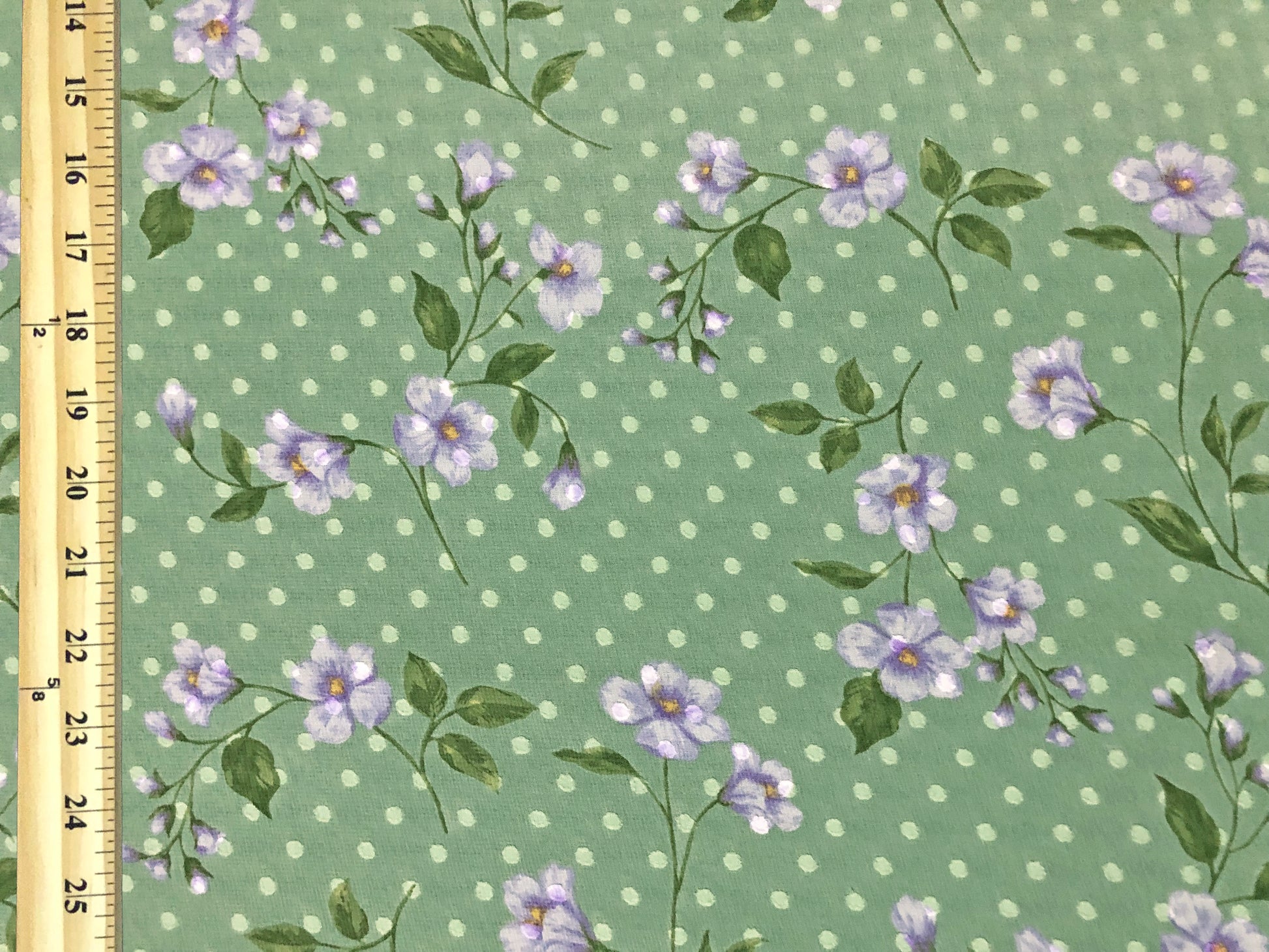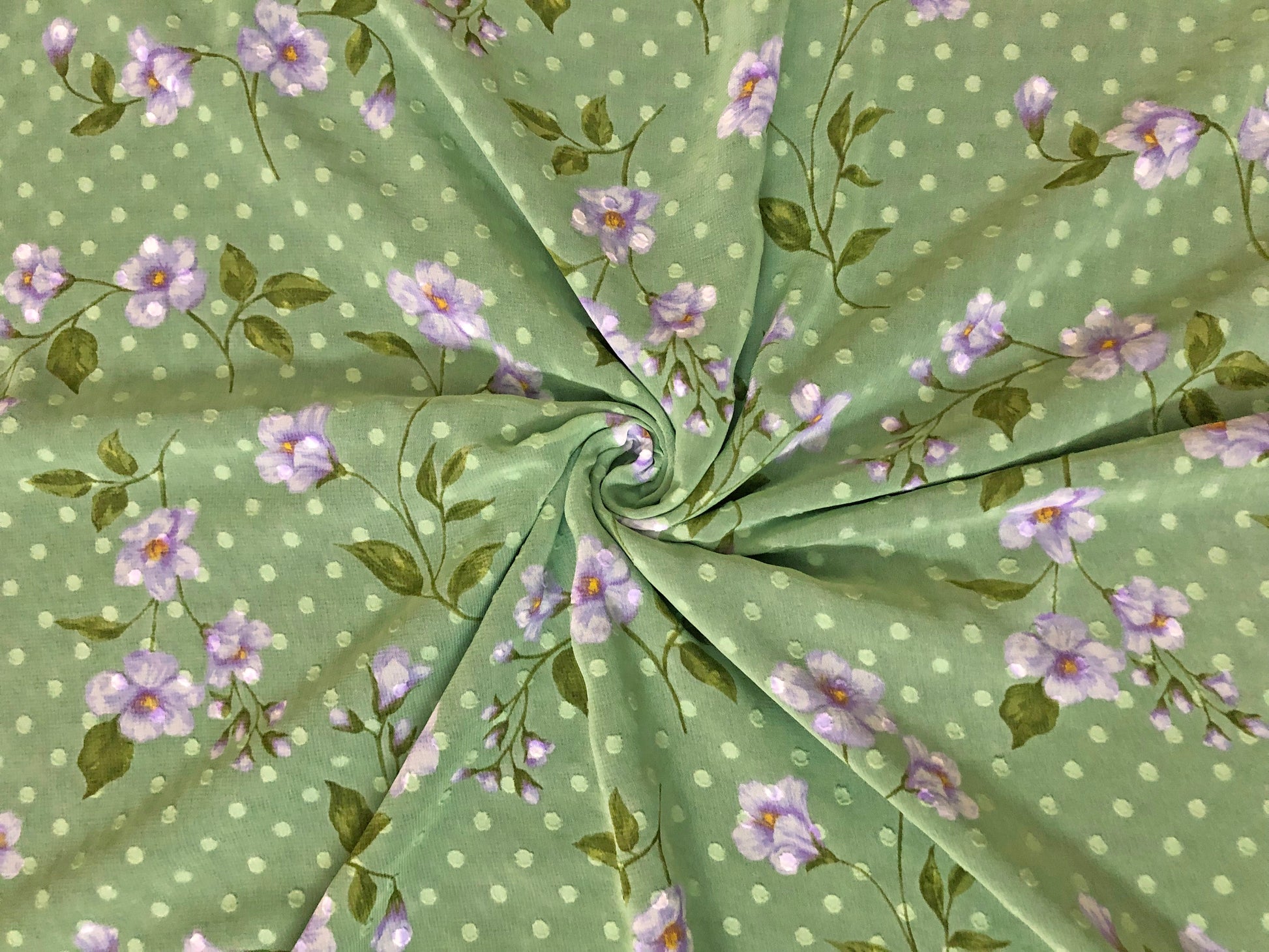 ✨ Soft, floaty, and romantic—this chiffon pairs a classic Swiss-dot texture with a sage-green ground scattered with lavender/lilac floral sprigs. Perfect for flutter sleeves, tiered dresses, and dreamy overlays.