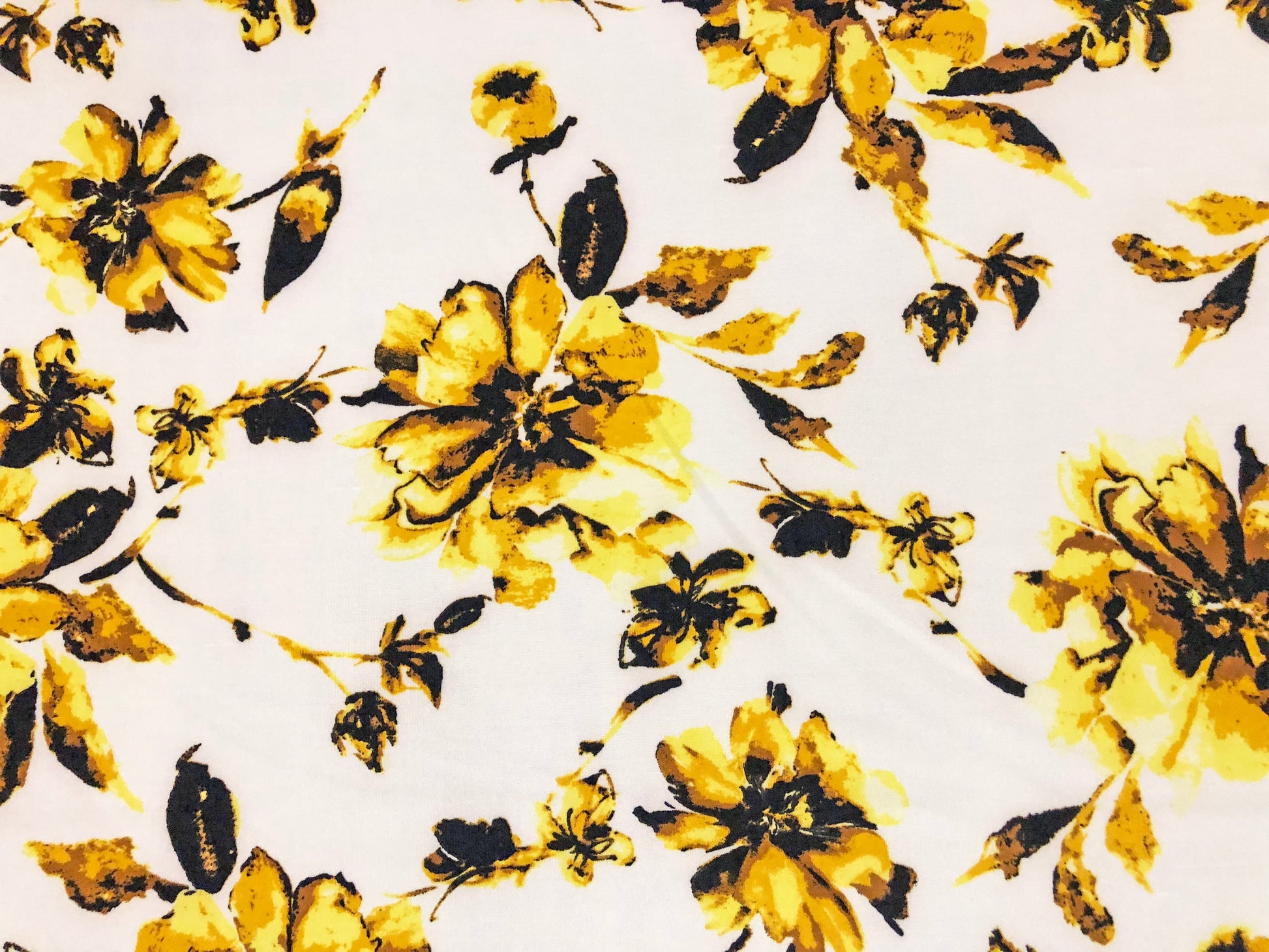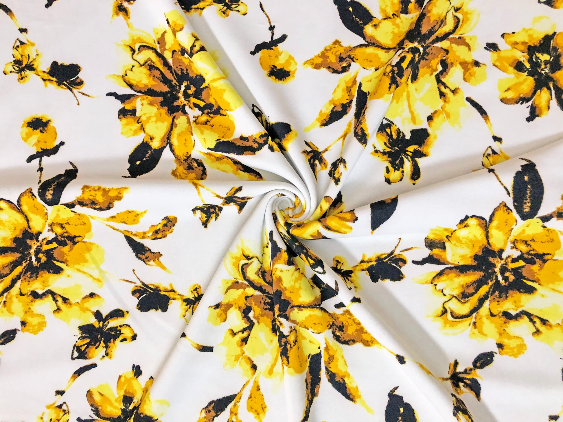 Sunlit style starts here. Golden mustard watercolor florals pop on a crisp white ground. This soft-touch Scuba Techno double knit delivers 4-way stretch, opaque 220 GSM coverage and sculpted drape—comfort and color that stay brilliant in every silhouette.