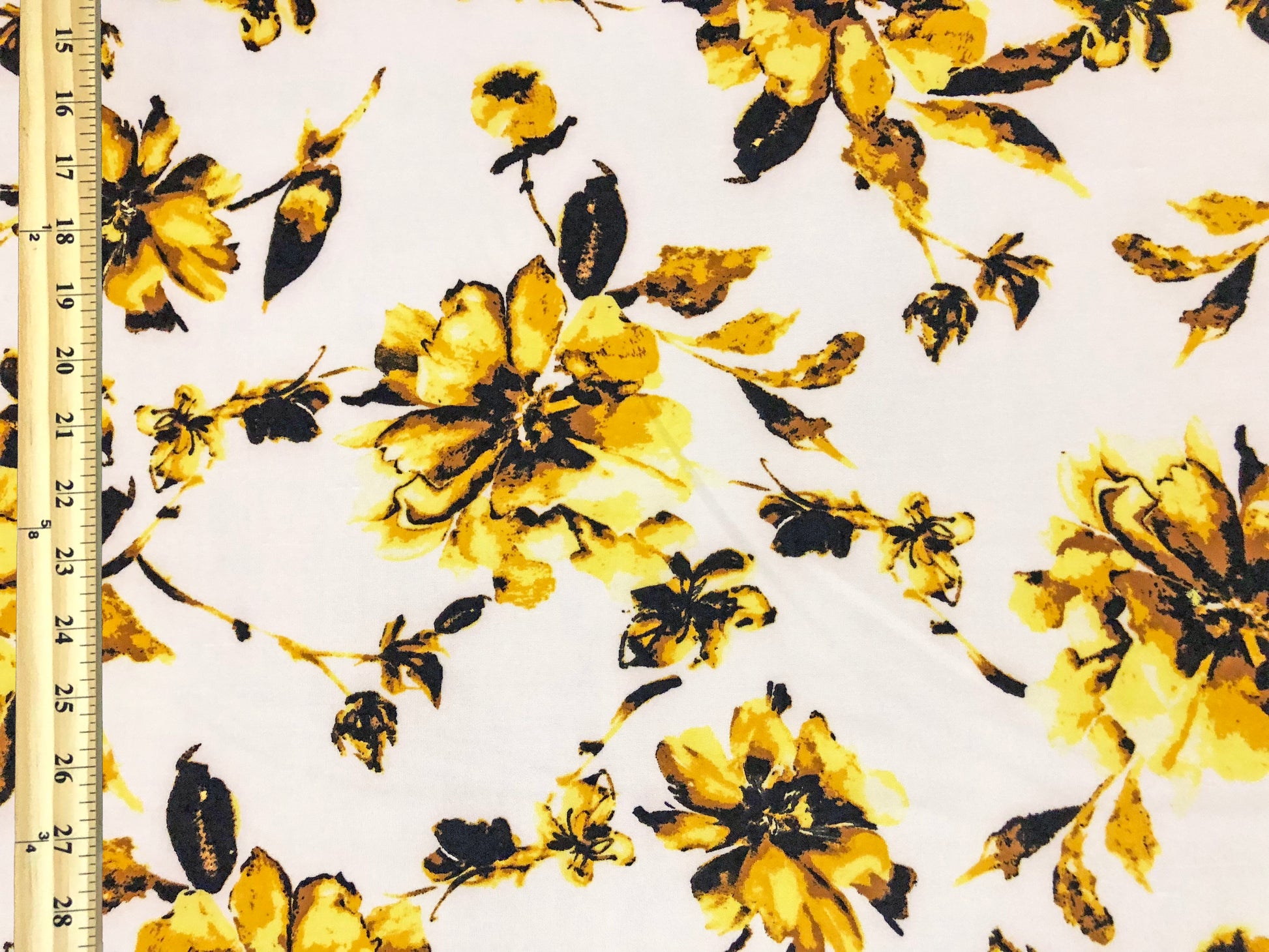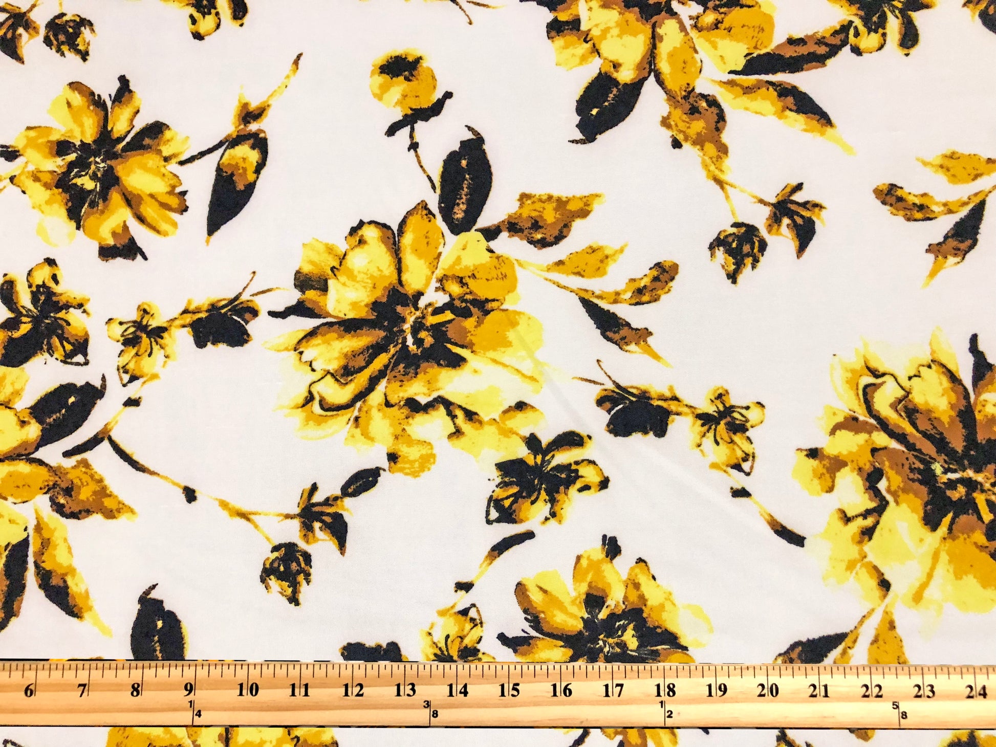 Scuba Techno Knit Fabric — White with Golden Mustard Watercolor Floral & Black Accents, Soft-Touch Double Knit, 4-Way Stretch, 56″, 220 GSM — By the Yard (SCTPR017)