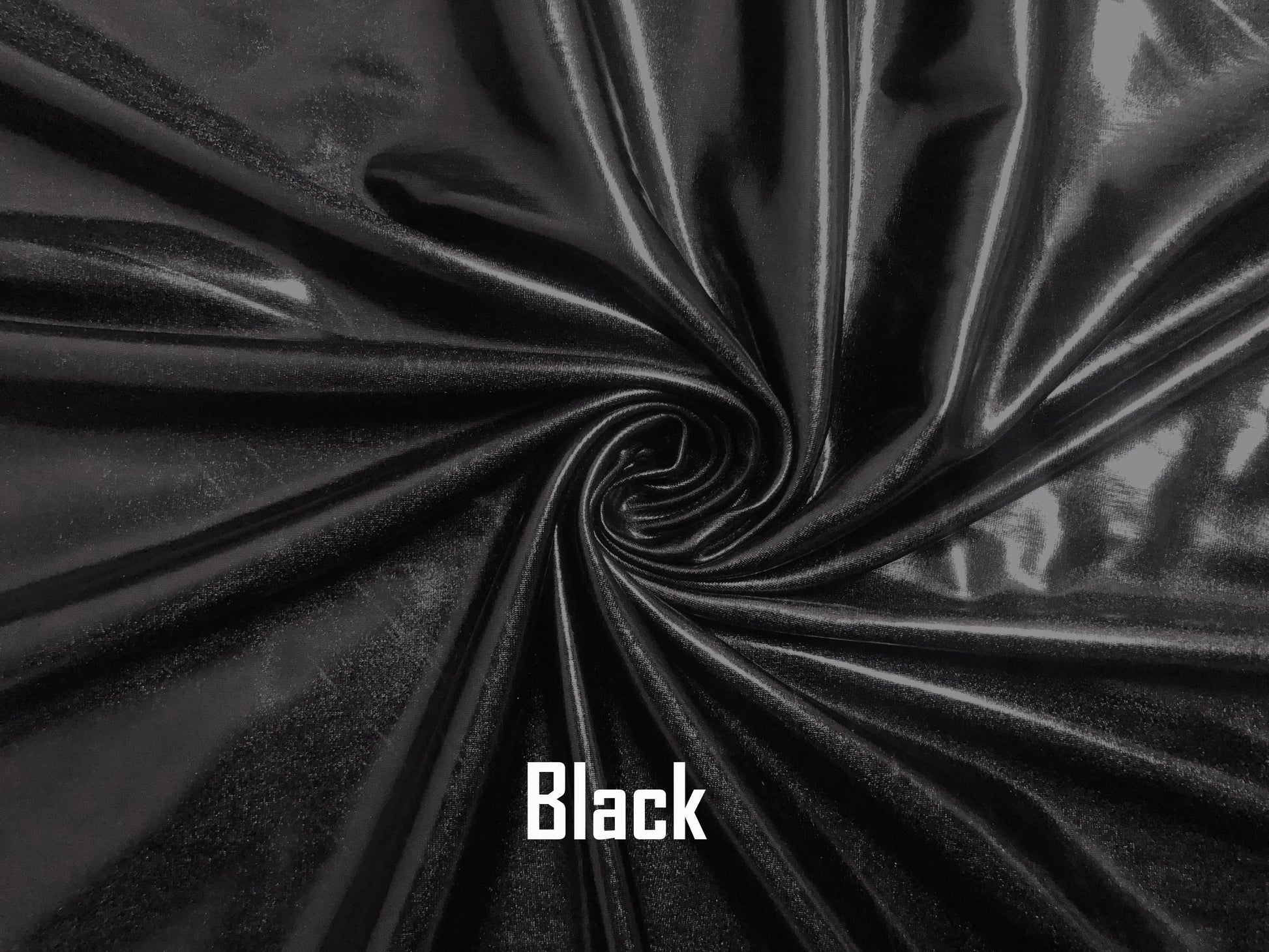 Shiny Black PU Vinyl — Wet-Look Mirror Shine, 2-Way Stretch | 58″ Wide | 95% Polyester / 5% Spandex | By the Yard (PUVMC01)