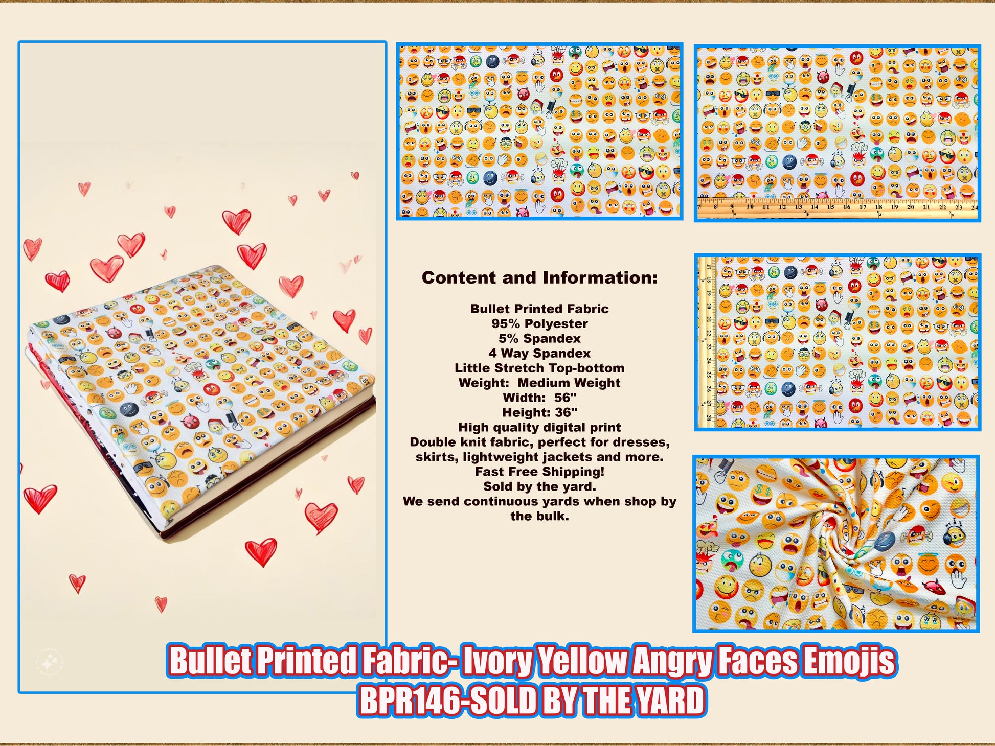 Unleash your creativity with our Soft & Stretchy Angry Face Emoji Bullet Knit Fabric. This premium Bullet knit features a beautiful print on a uniquely textured surface that adds depth to any project. This fabric is beloved by fashion designers and home sewists alike for its versatility. Create anything from stylish dresses, skirts, and leggings to adorable headbands, bows, and baby outfits – the possibilities are endless