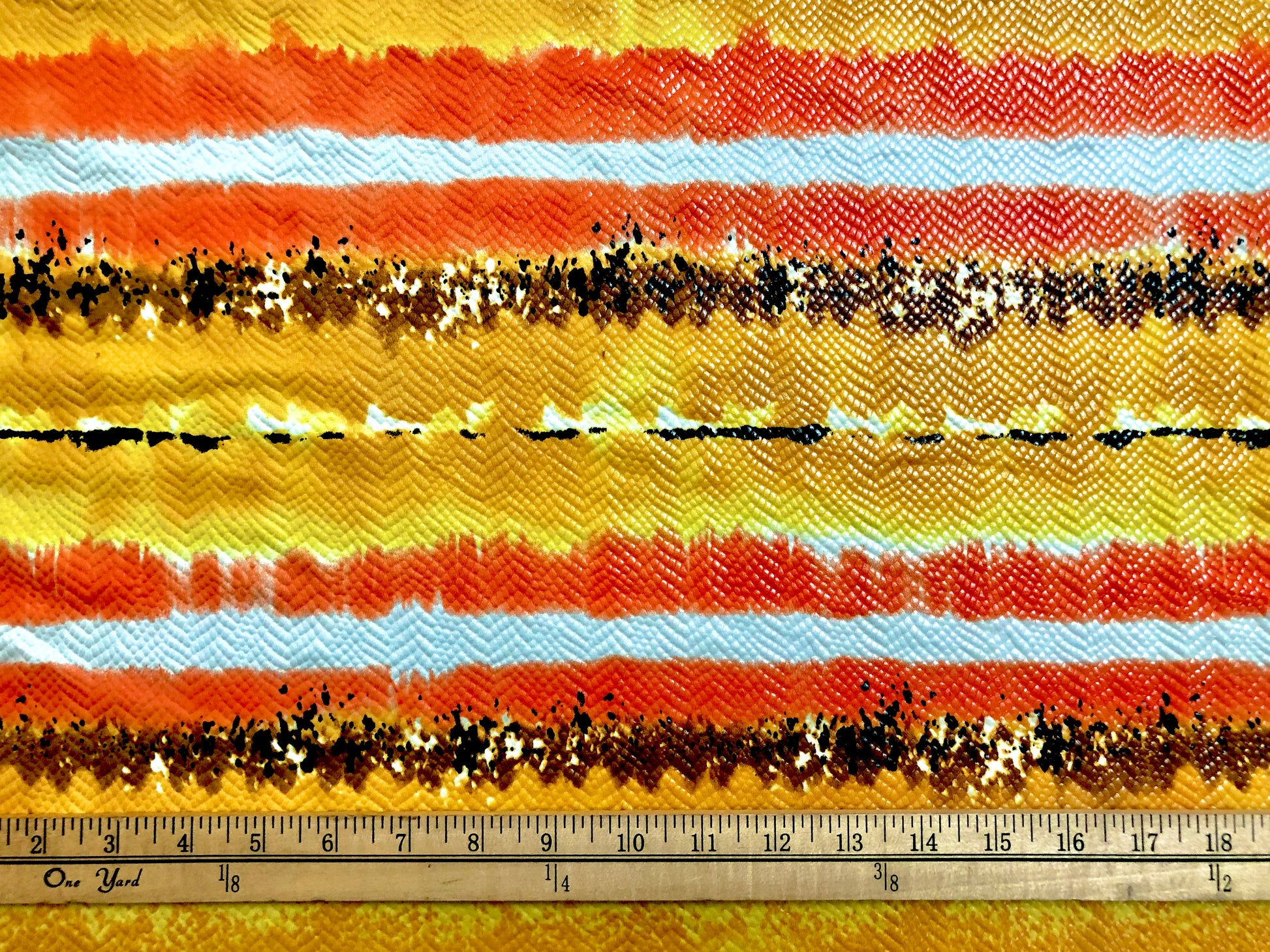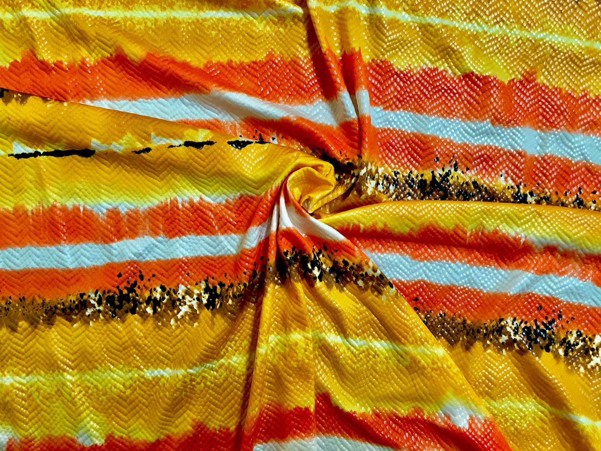 • 🎨 Color/Print: Sunset wavy stripes—orange, marigold, white, black speckle (directional)