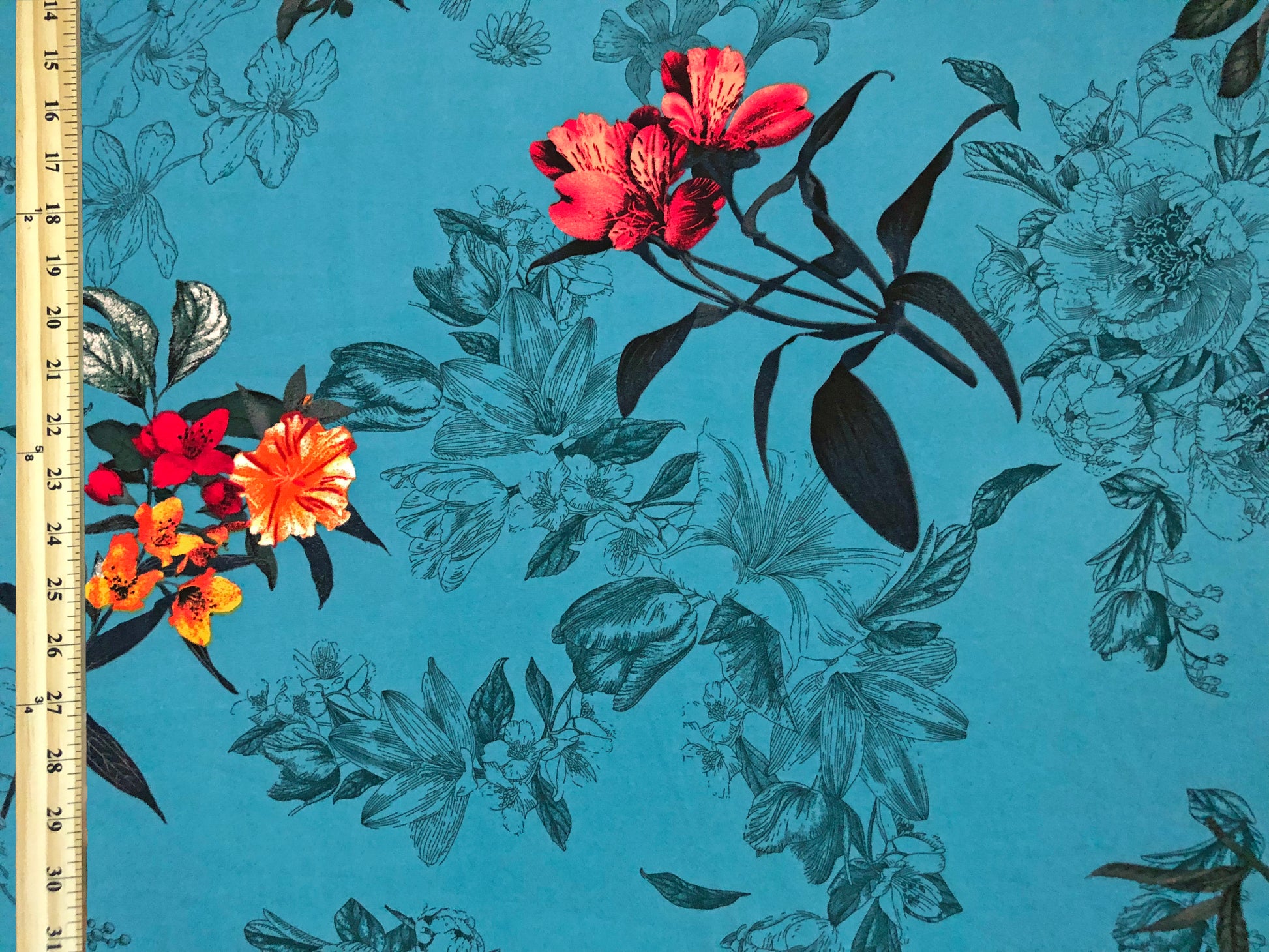 Turn heads with this statement fabric: a saturated teal ground with painterly red-orange blossoms and inky botanical linework. Soft matte hand and floaty drape make it perfect for dresses, blouses and scarves.