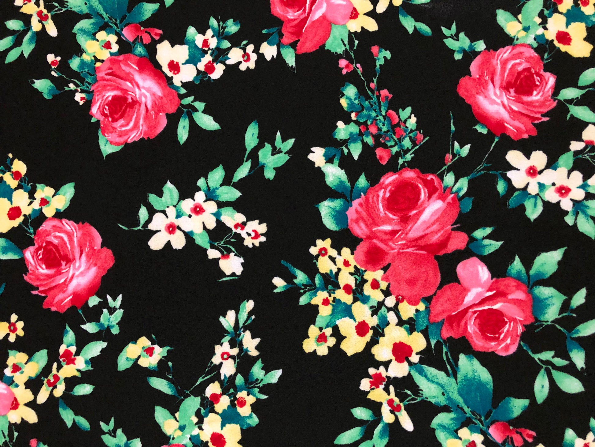 Techno Crepe Knit – Black Rose Floral (Pink/Mint/Butter Yellow/White), 4-Way Stretch, 240 GSM, 56" Wide, Double Knit – Sold by the Yard (TCRP0113)