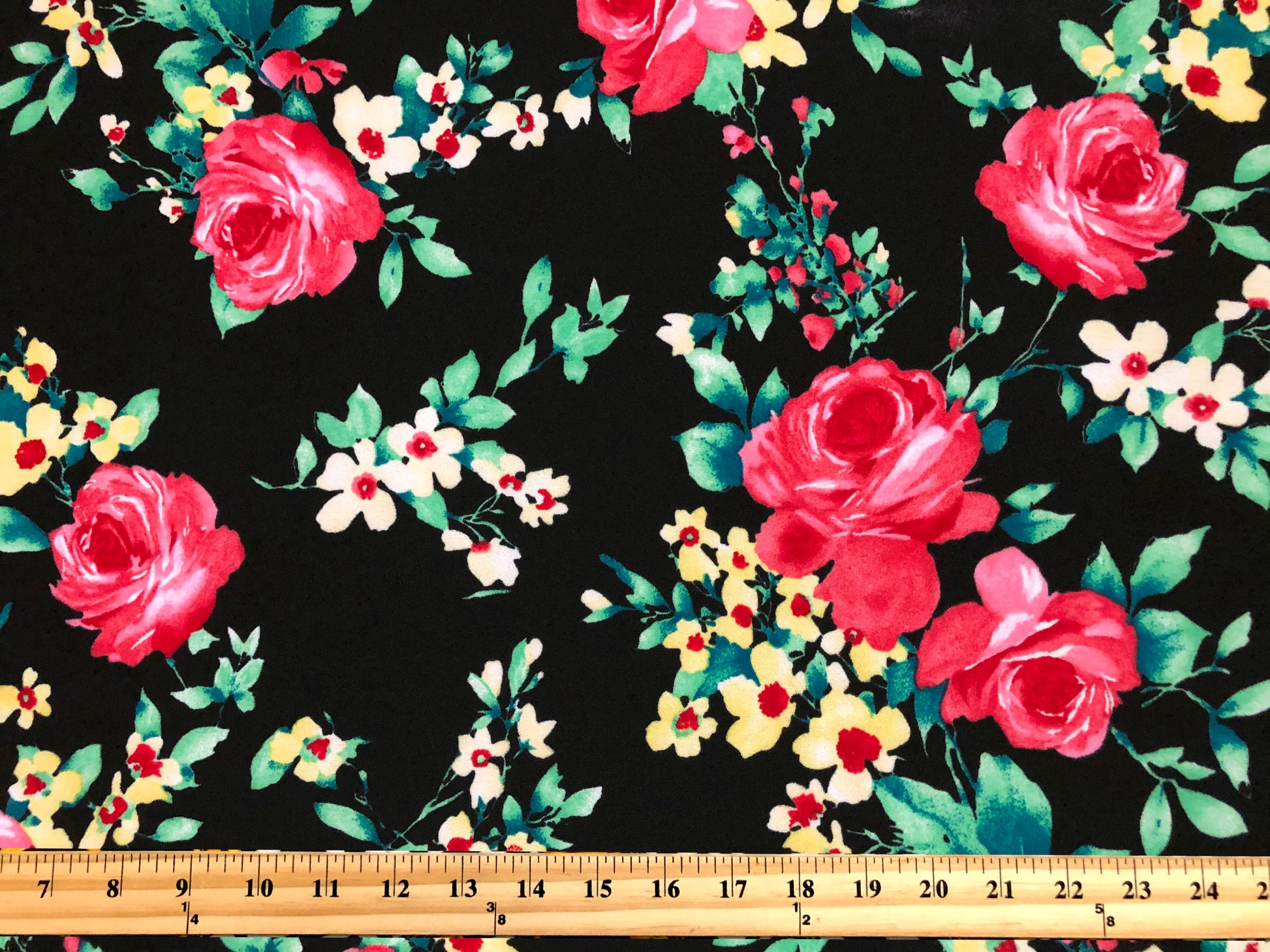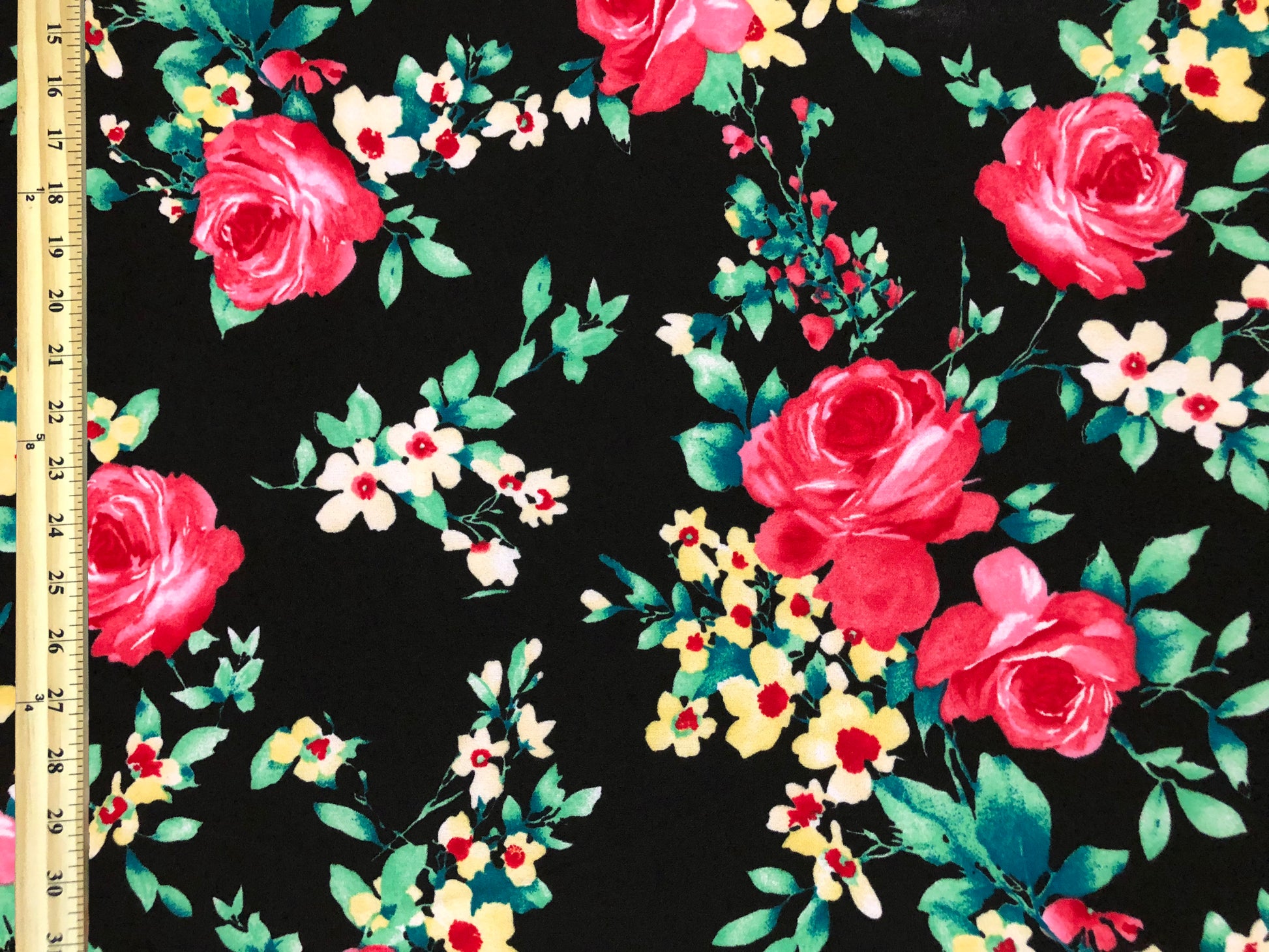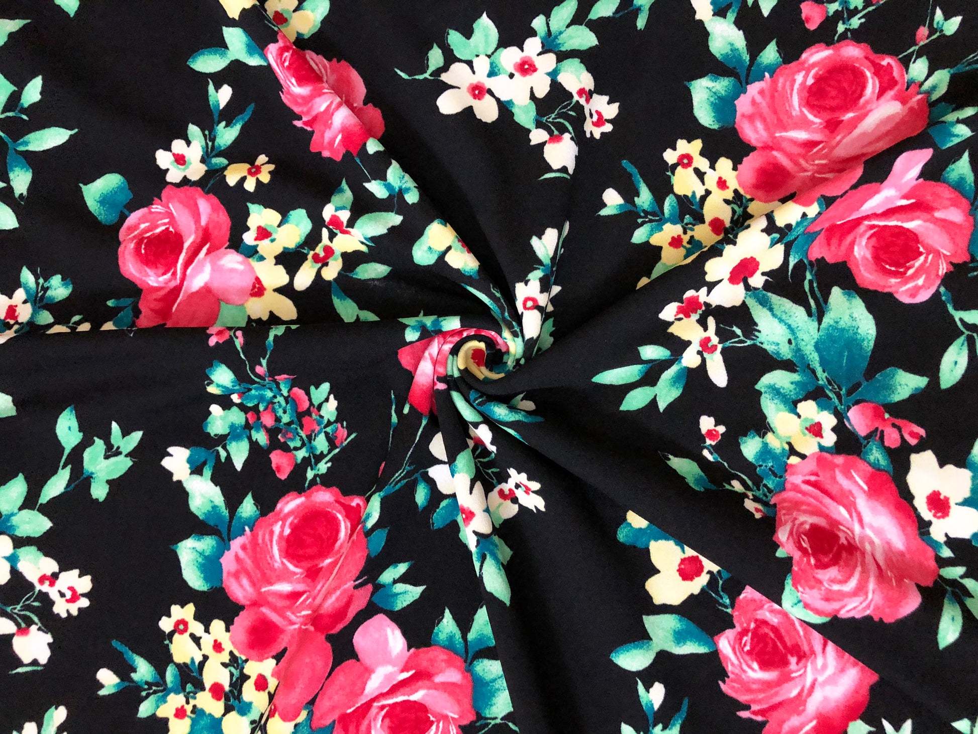 Bold rose bouquets bloom on inky black Techno Crepe—smooth to the touch, fully opaque and confidently 4-way stretchy. At 240 GSM and 56″ wide, this stable double knit sews clean, holds shape, and rebounds beautifully for photo-ready dresses, skirts and bows.