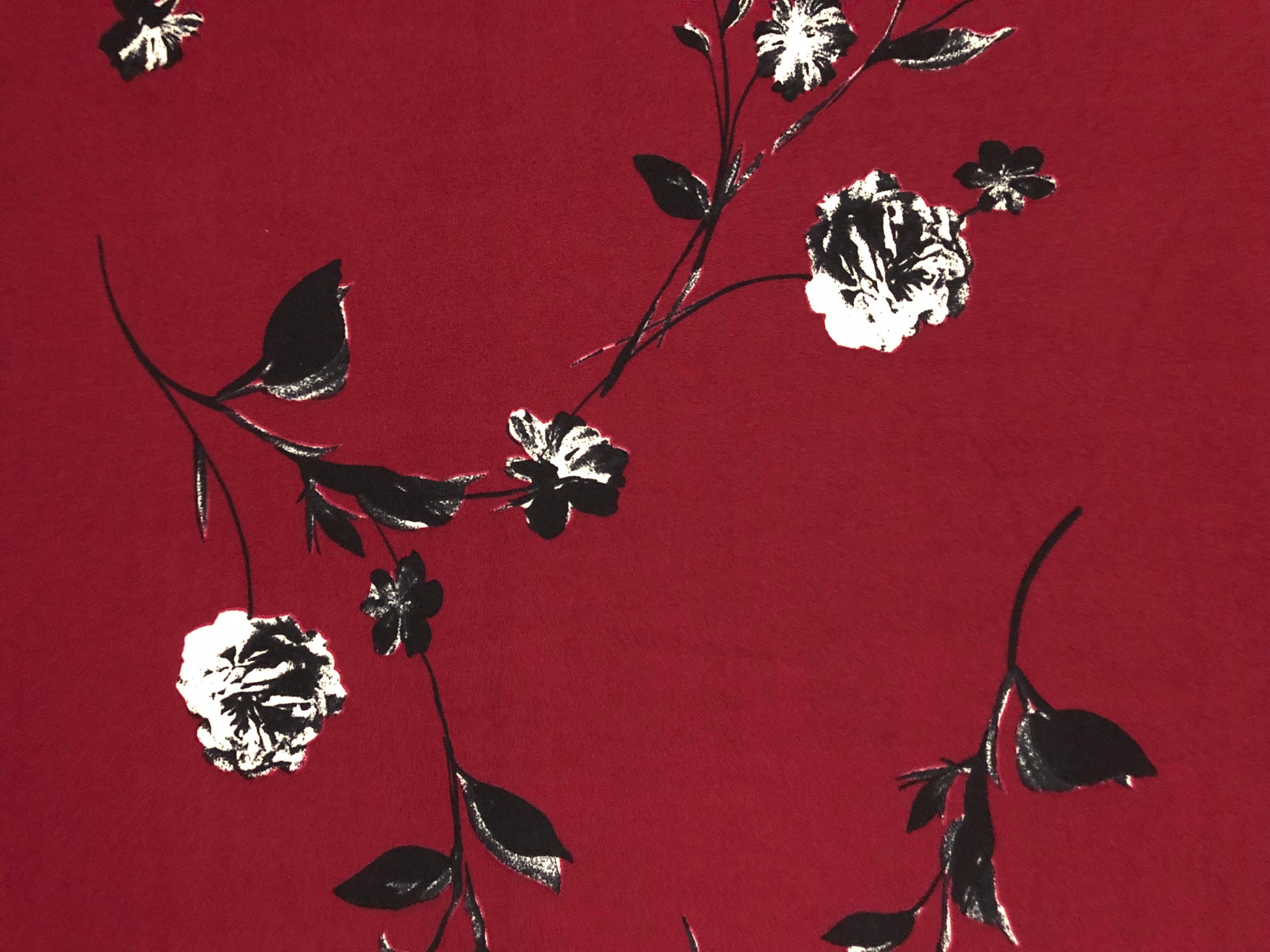 Command attention with this burgundy Techno Crepe blossoming in black-and-white florals. A smooth crepe face, opaque coverage, and confident 4-way stretch create crisp, photo-ready silhouettes. At 240 GSM and 56" wide, it sews cleanly and recovers beautifully.