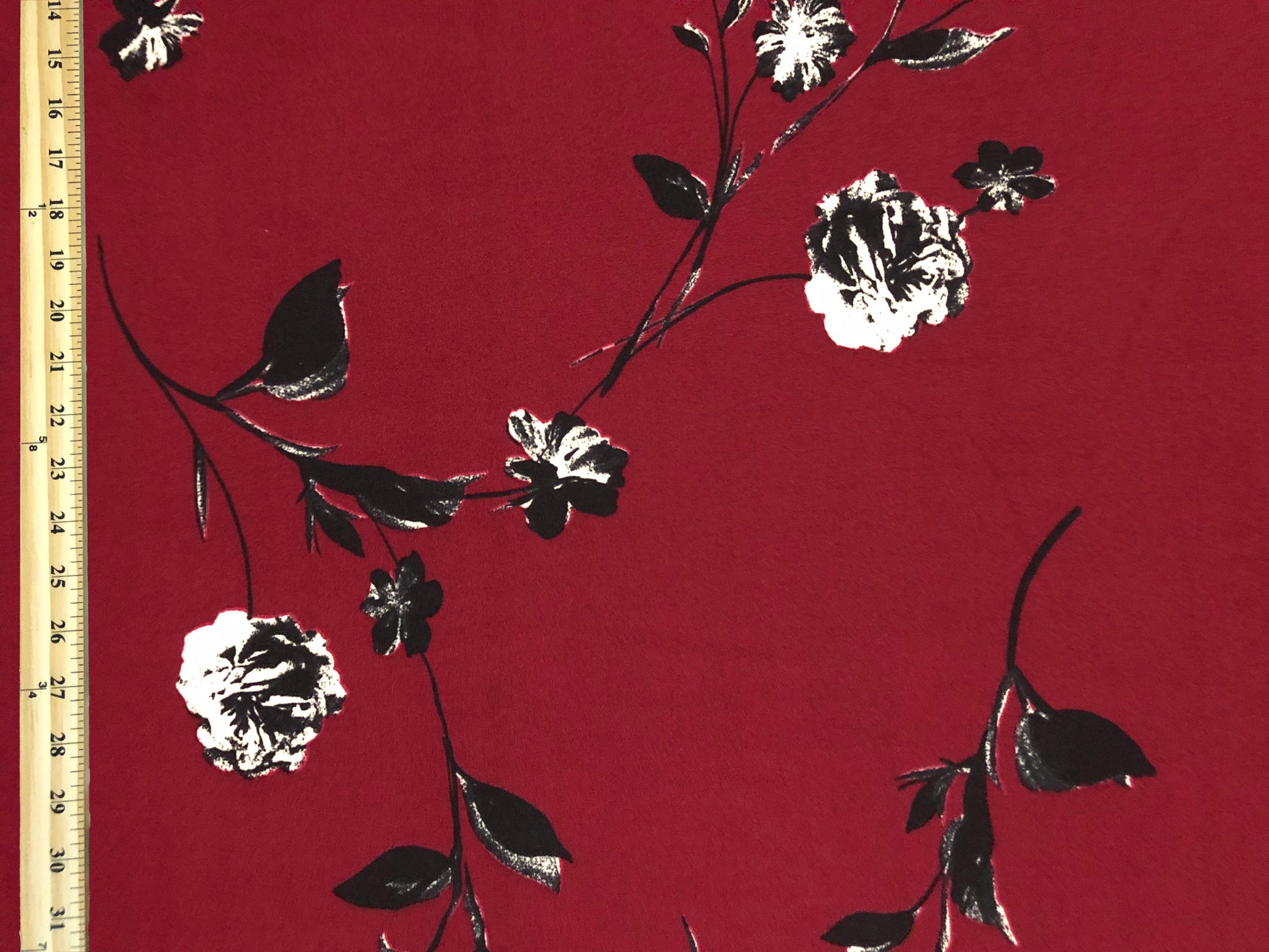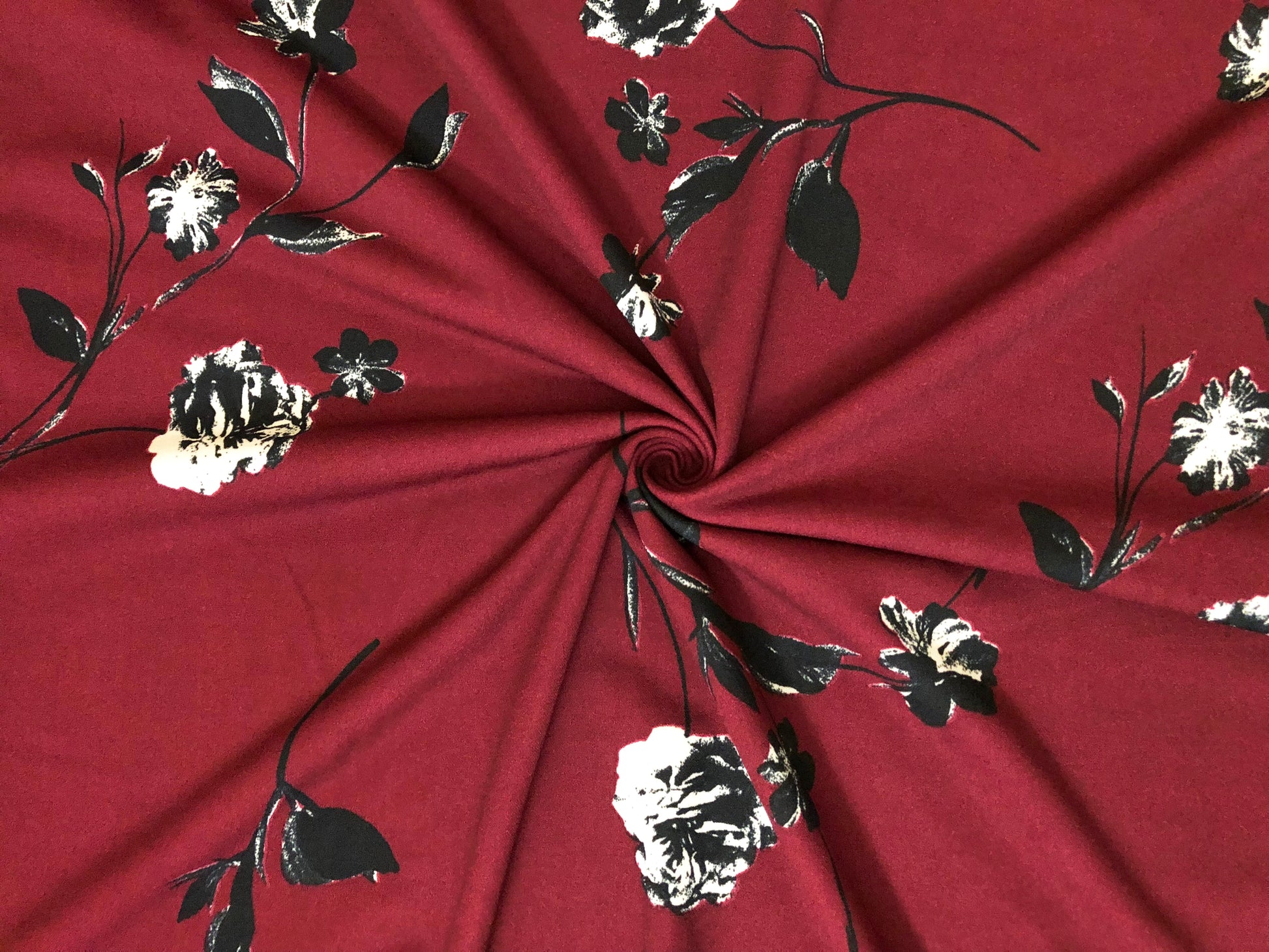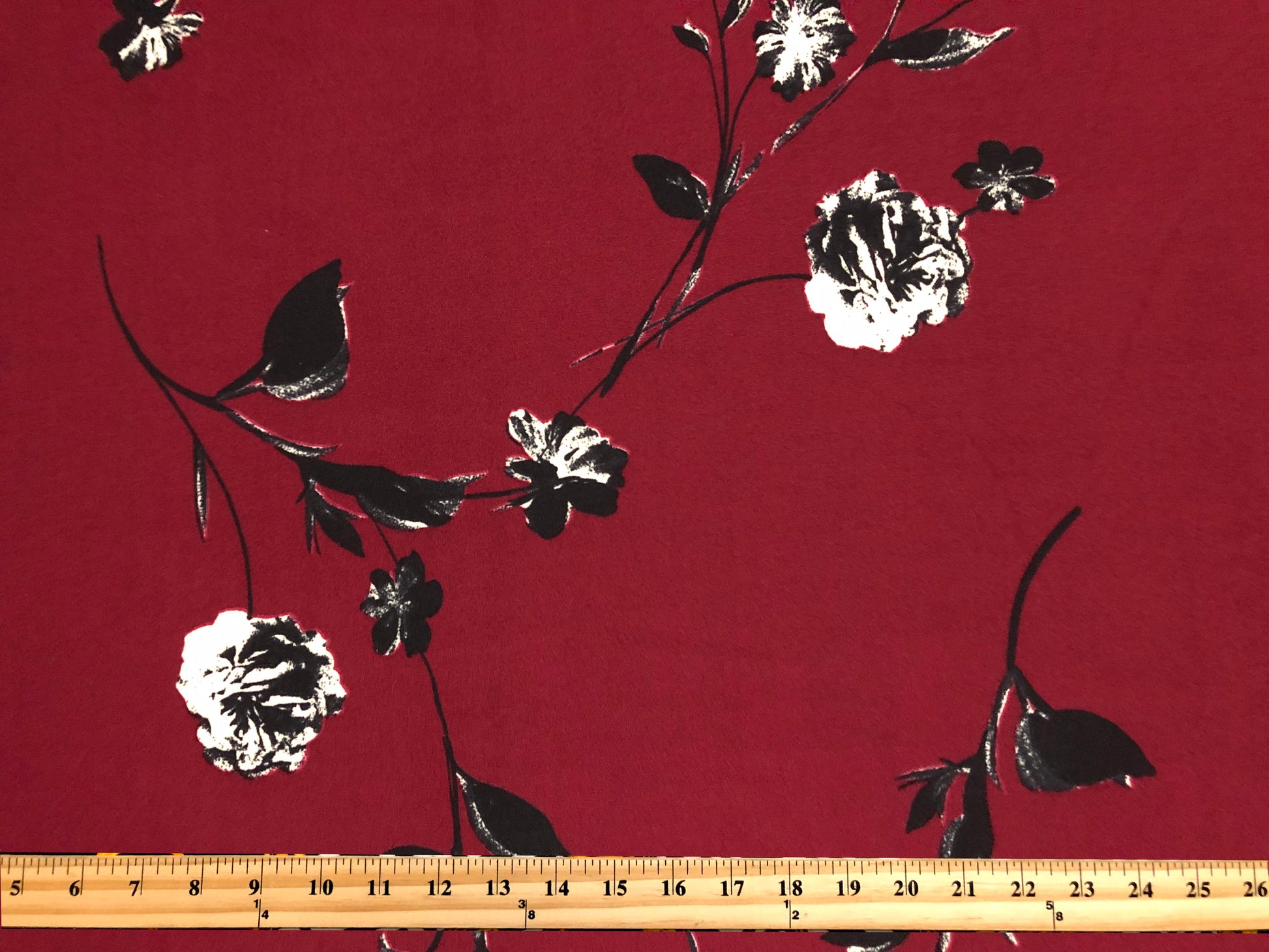 Techno Crepe Knit – Burgundy Floral (Black & White), 4-Way Stretch, 240 GSM, 56" Wide, Double Knit – Sold by the Yard (TCRP0110)