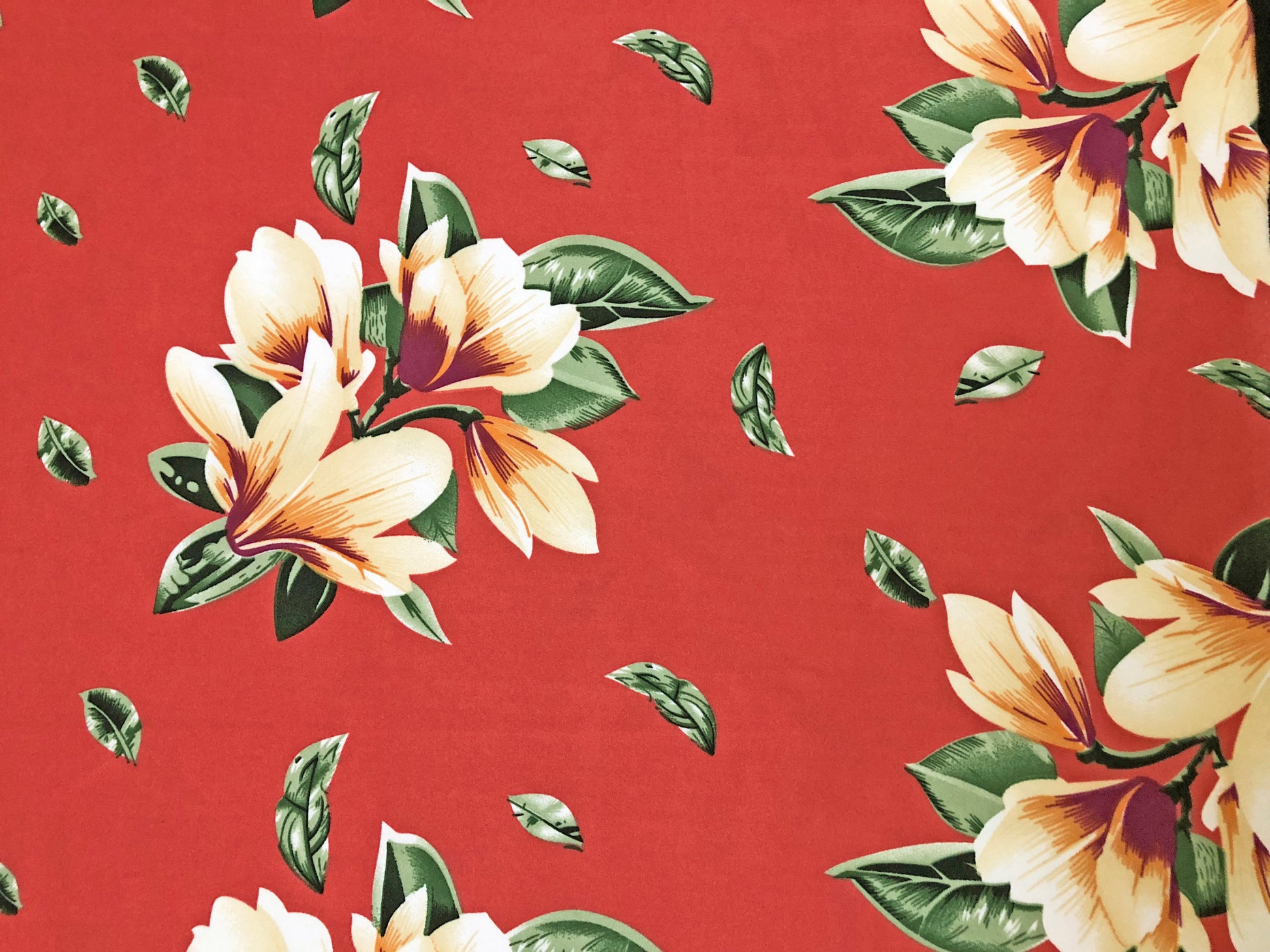 • 🌺 Color/Print: Coral red ground with buttercream & saffron magnolias / pine green leaves