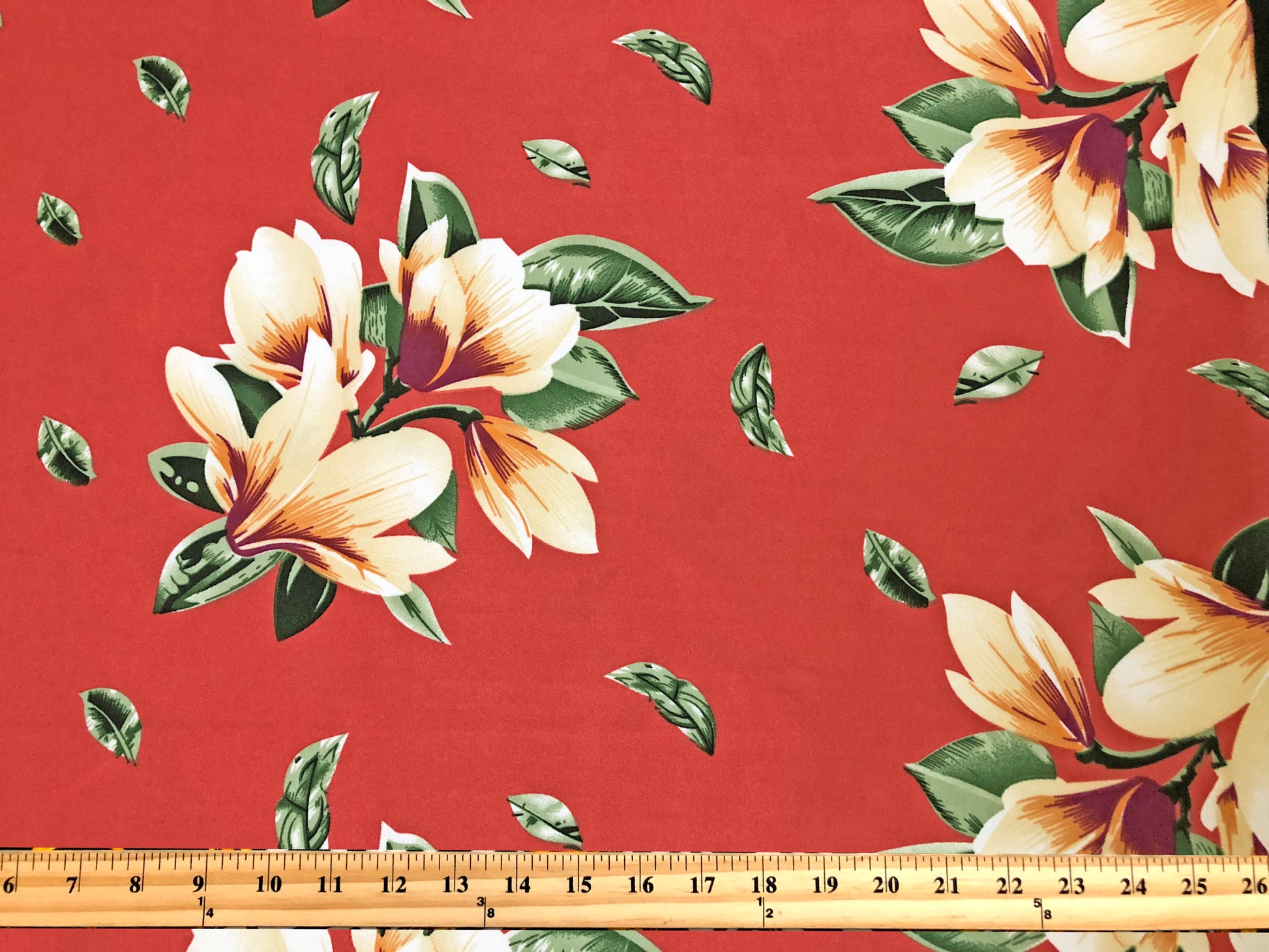 Turn vacation vibes into polished outfits. This coral Techno Crepe delivers structured drape with 4-way stretch. A photogenic matte surface and 240 GSM body hold crisp lines while buttercream magnolia blooms and green leaves glow across rich coral red.