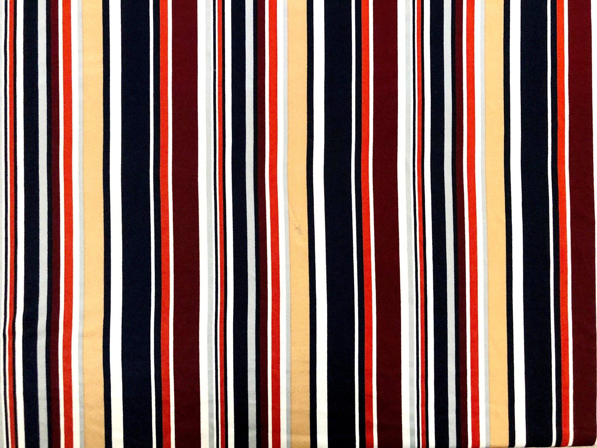 Turn heads with our premium Techno Crepe Knit—silky crepe hand, fluid yet tailored drape, and resilient 4-way stretch. Vertical navy, burgundy, mustard-gold, red, white and gray stripes elongate the silhouette for polished comfort that moves with you.