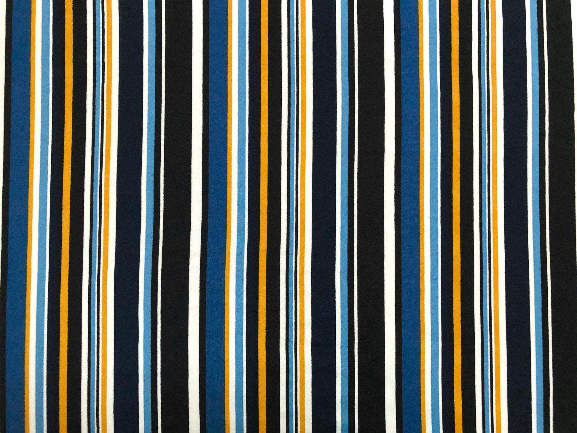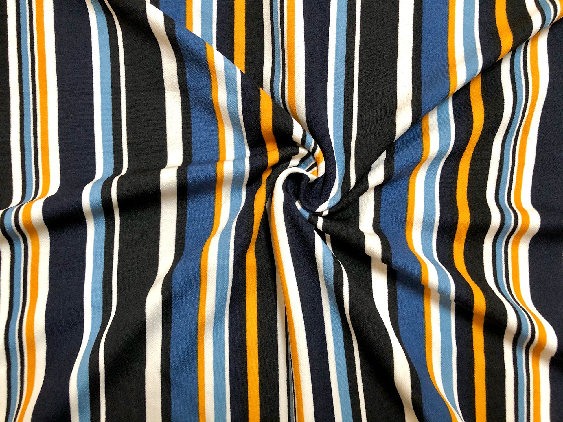 Techno Crepe Knit Fabric – 4-Way Stretch, Silky Drape, Wrinkle-Resistant, 56″ Wide, 240 GSM – Navy/Teal/Sky Blue/Gold/White/Black Vertical Stripe – Sold by the Yard-(TCRP011)
