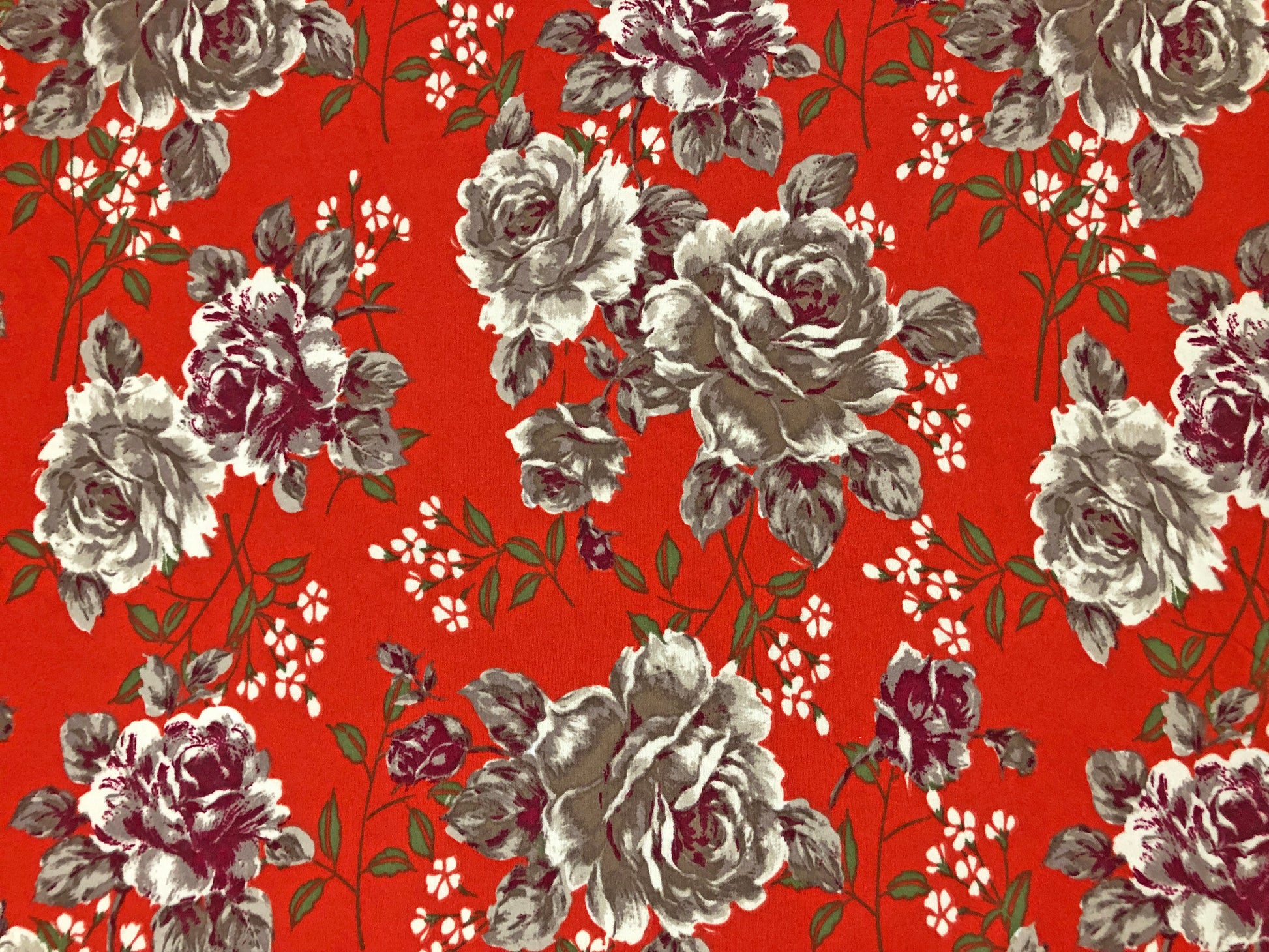 Turn heads with this luxe Techno Crepe Knit. A bold red orange ground makes brown and burgundy roses glow with ivory blossoms and green leaves. Silky hand-feel, buttery drape and shape-retaining 4-way stretch. Opaque 240 GSM keeps garments smooth and comfortable.