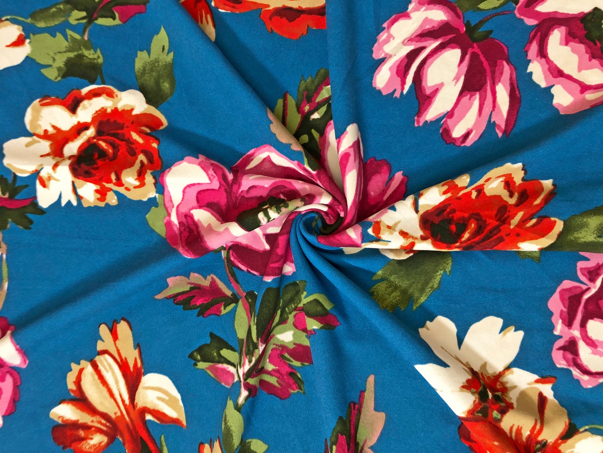 Techno Crepe Knit Fabric – Teal Blue with Fuchsia, Red & Ivory Florals, Green Leaves – 4-Way Stretch, 56" Wide, 240 GSM, Silky Drape – Sold by the Yard (TCRP041)
