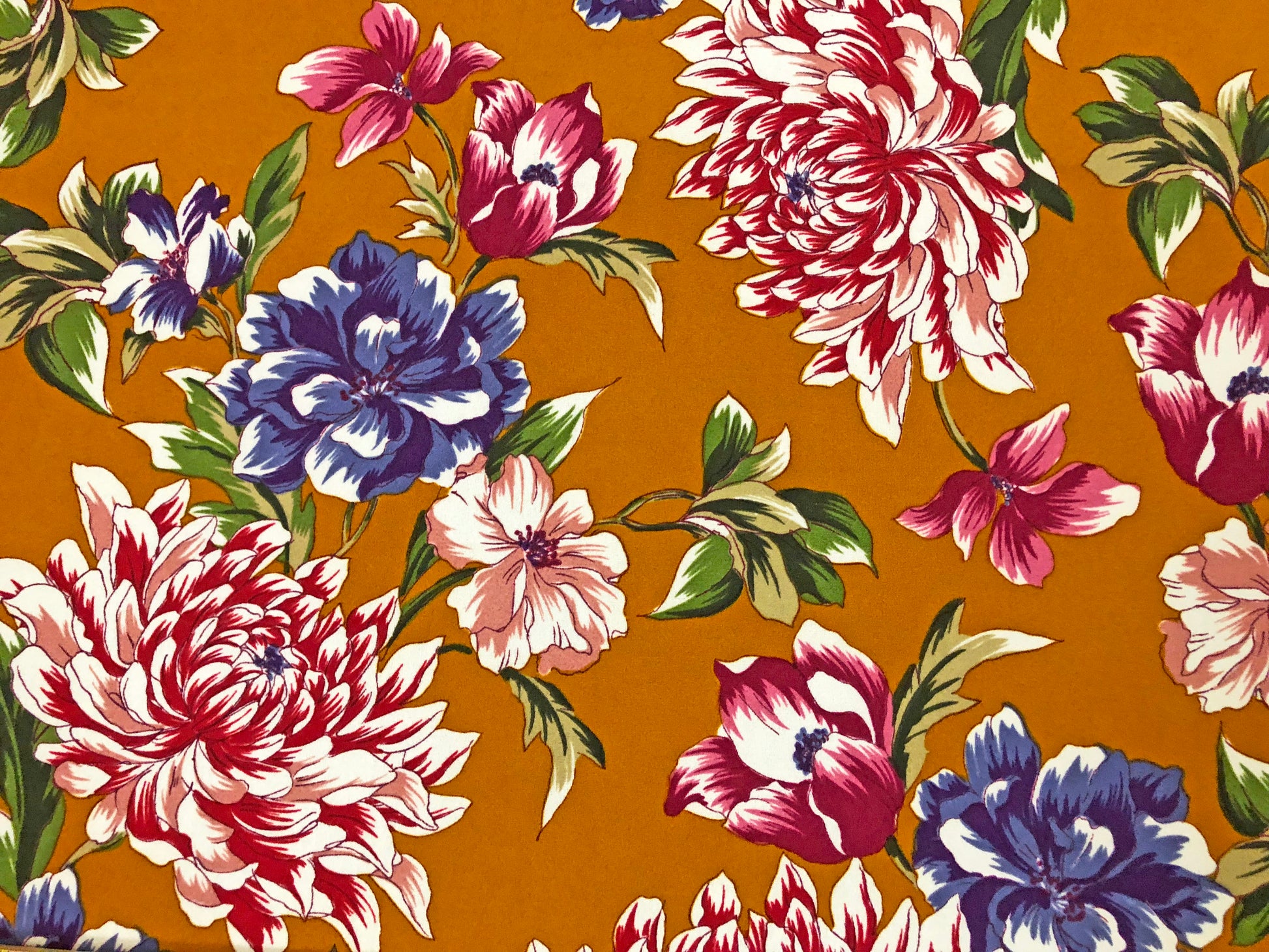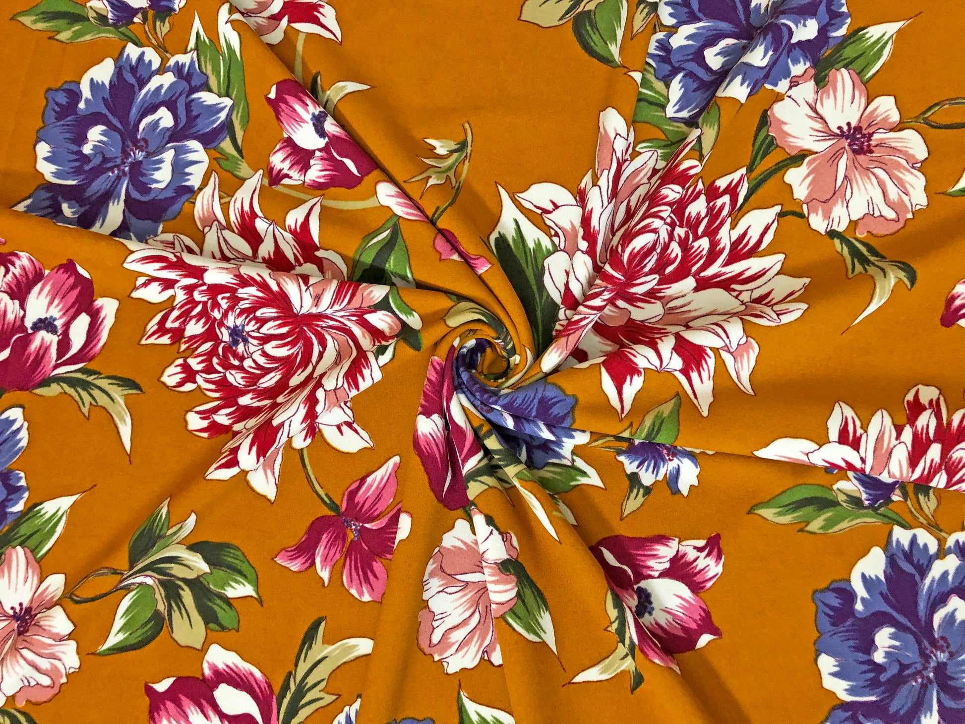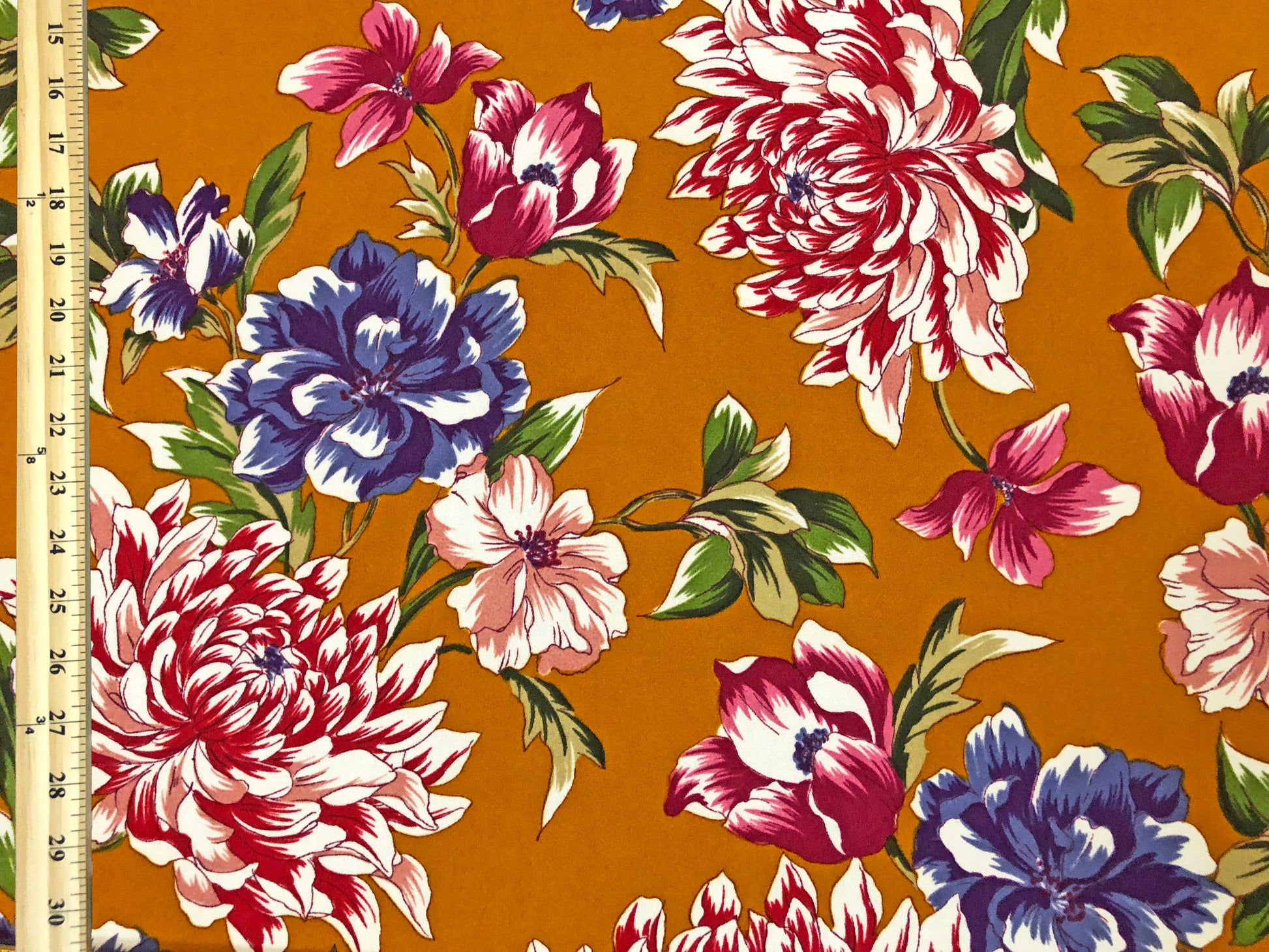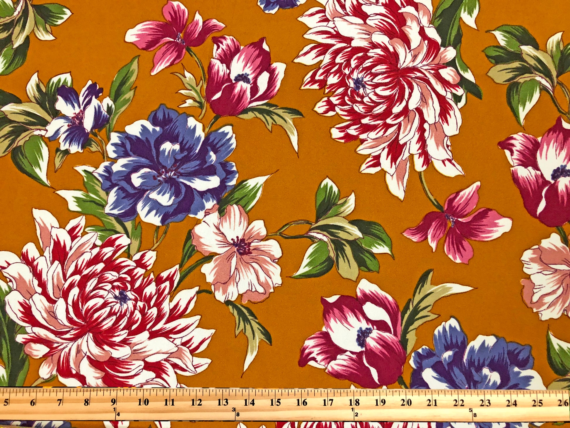 Techno Crepe Knit – Mustard Floral (Burgundy/Blue/Blush/Green/White), 4-Way Stretch, 240 GSM, 56" Wide, Double Knit – Sold by the Yard (TCRP0116)