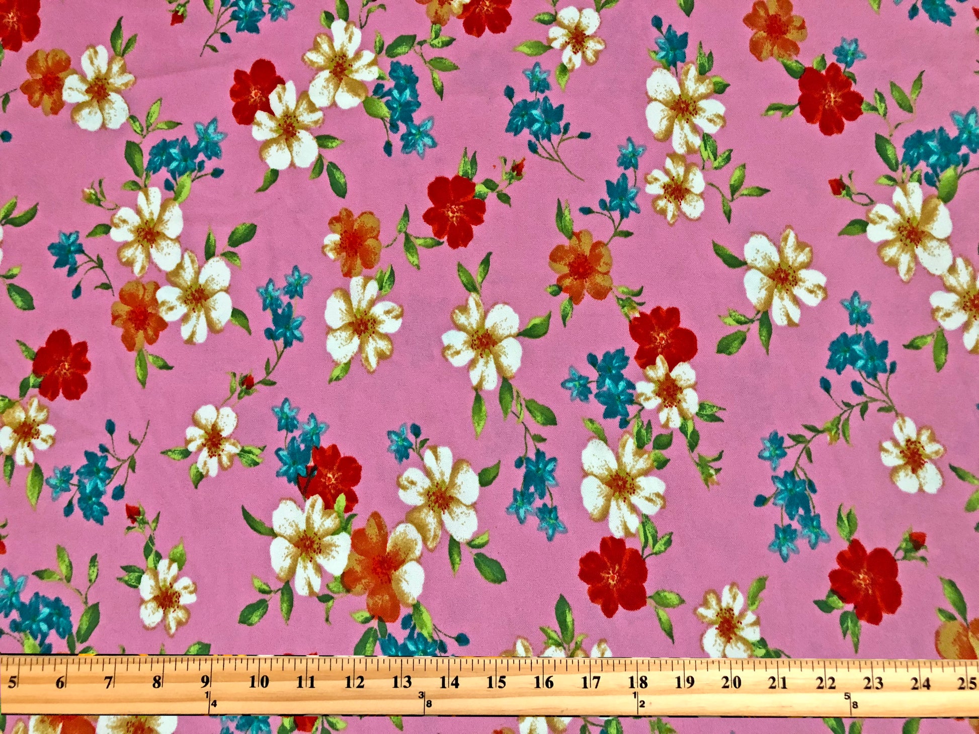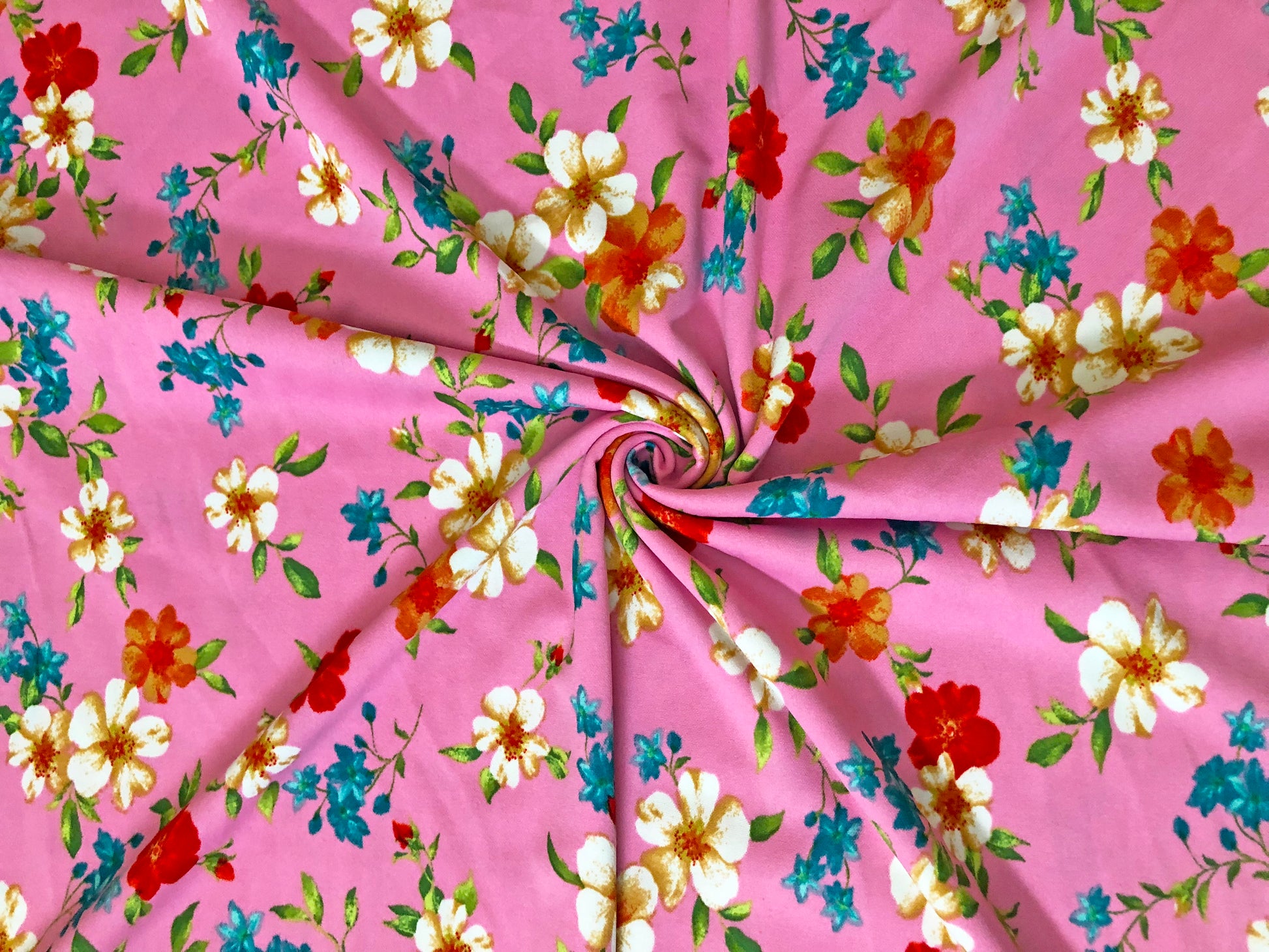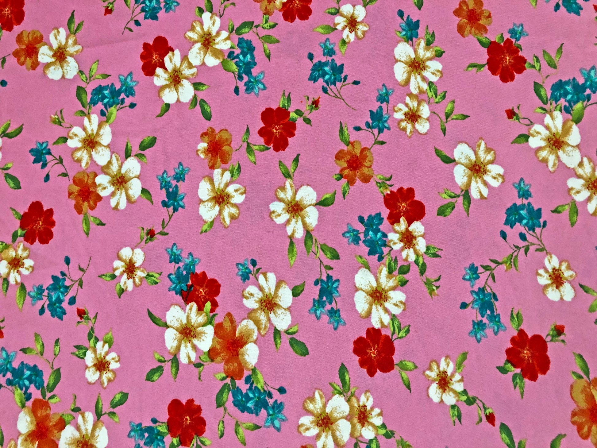 Bring instant joy to your makes: this Pink Floral Techno Crepe delivers couture-level structure with comfy 4-way stretch. A matte, photo-ready surface and 240 GSM body keep lines crisp while white, red, coral and teal blossoms pop against the pink ground.