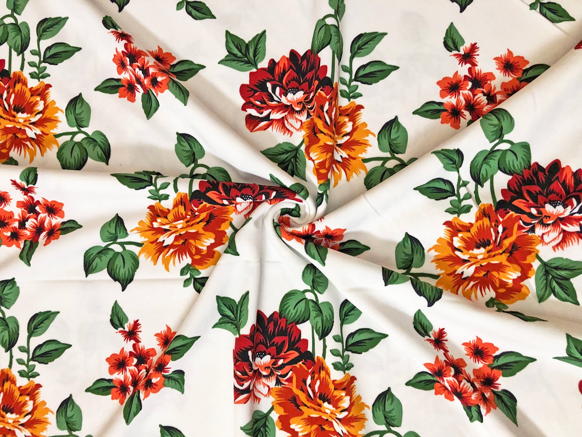 • 🌼 Color/Print: White ground with scarlet & marigold florals / emerald green leaves