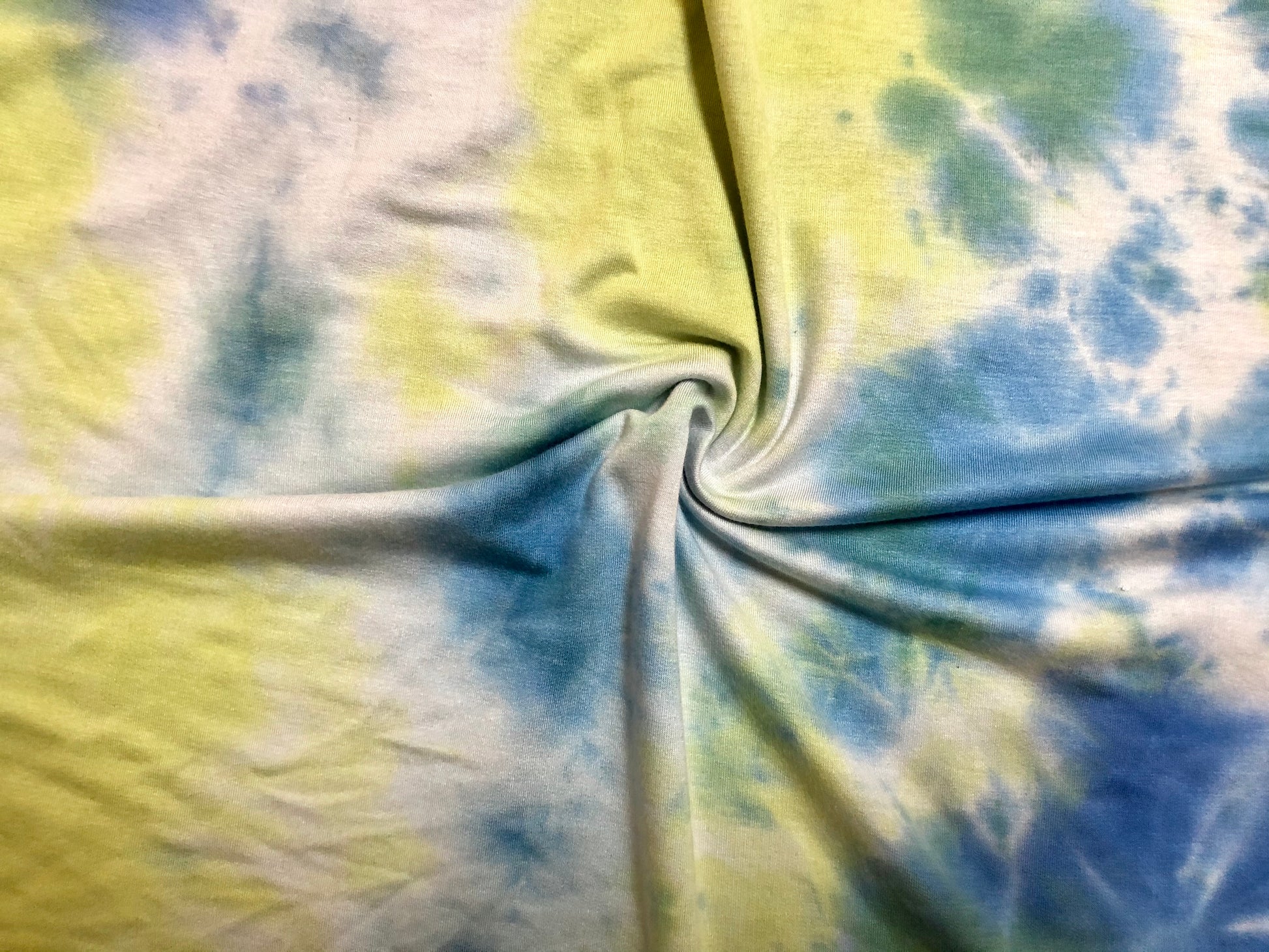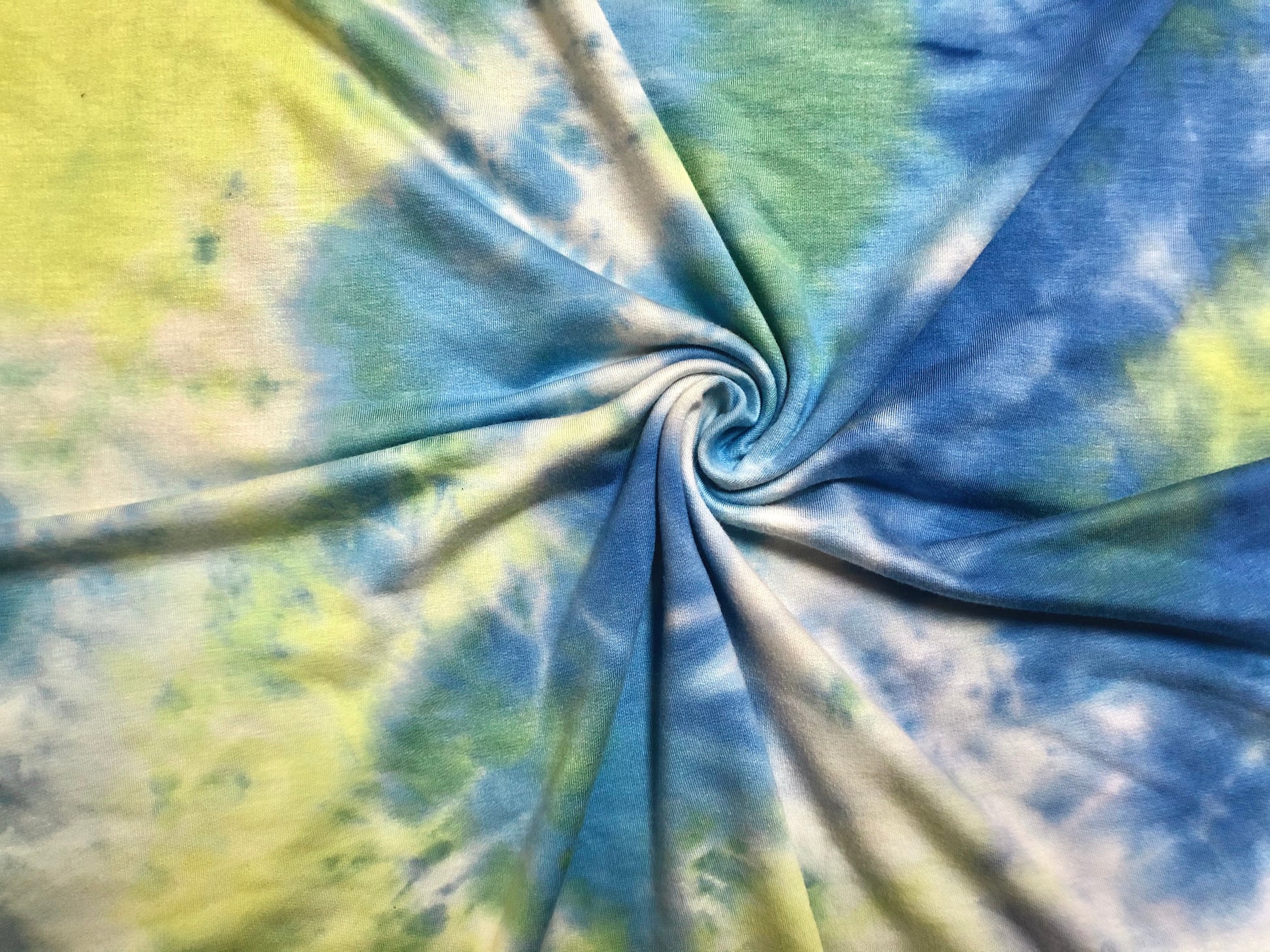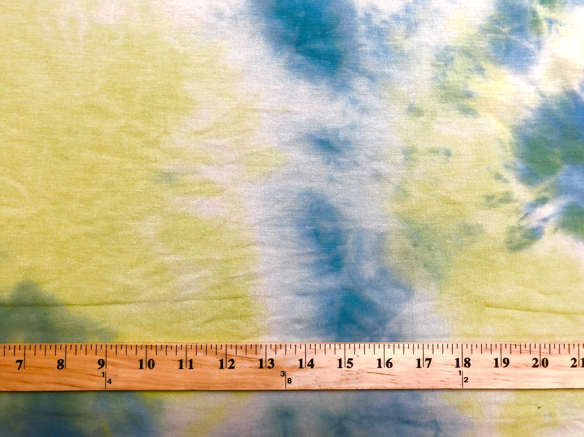Vibrant Tie-Dye French Terry Knit Fabric – Blue, Yellow & Green | 56" Wide Rayon-Poly-Spandex Stretch | Soft, Stylish & Sold by the Yard (FTKTD02)