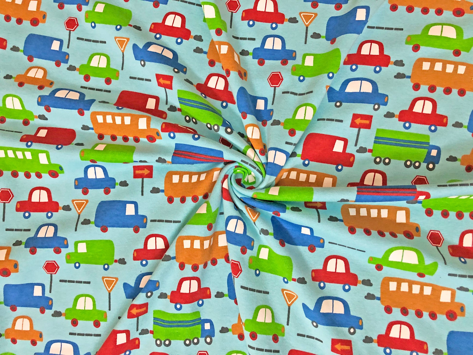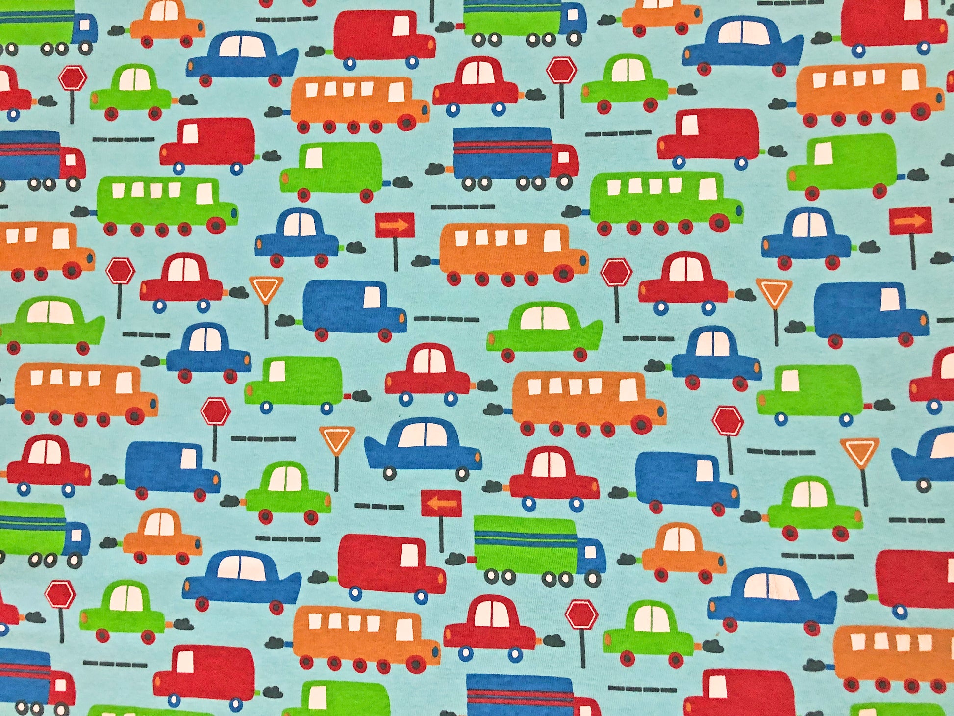 • 🎨 Pattern: Cars, buses, trucks & road signs on sky blue (multi-directional)