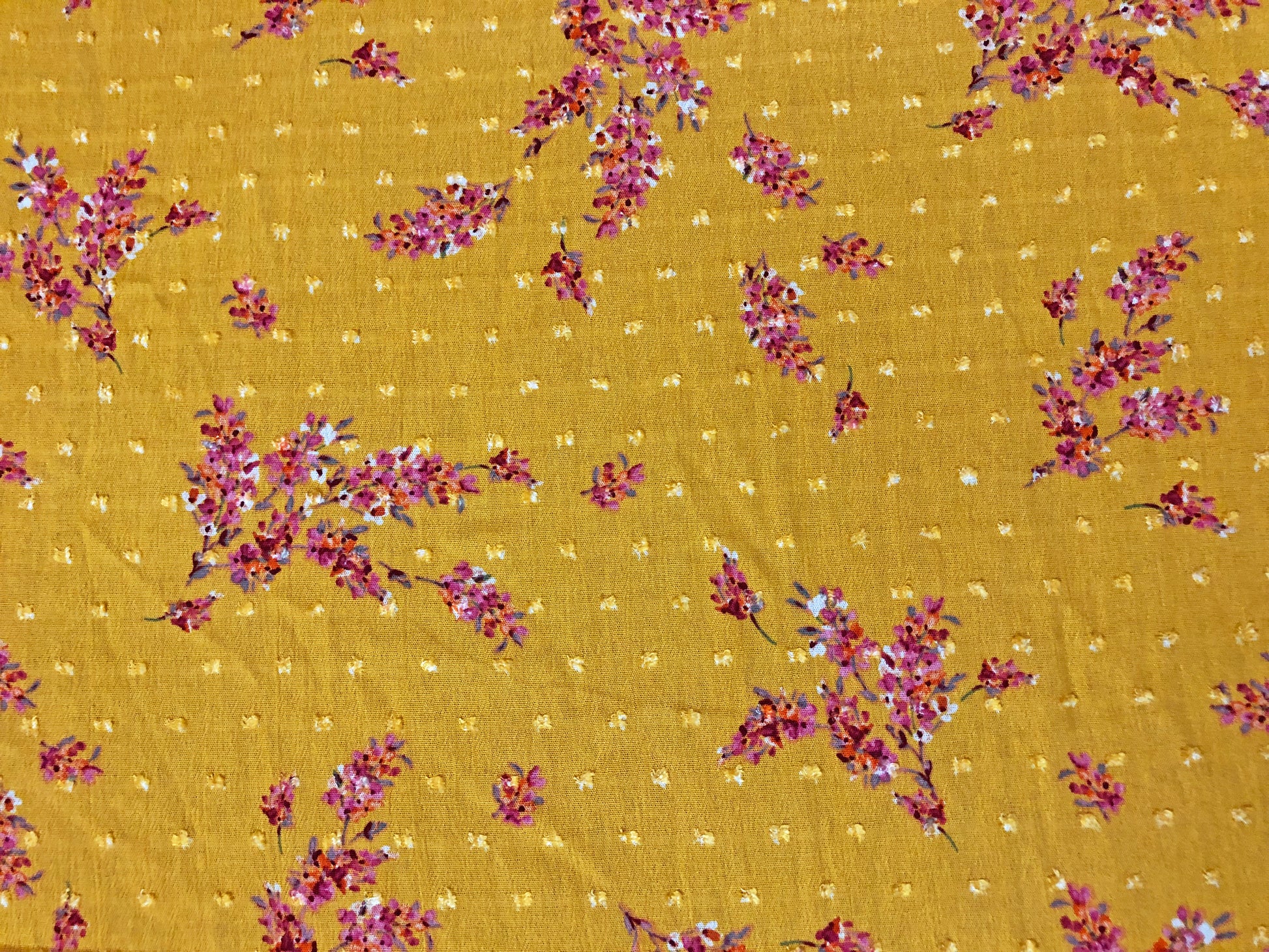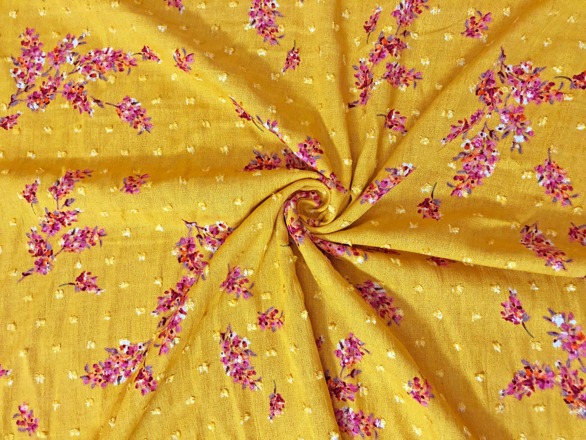 Vibrant Mustard Swiss Dot Rayon Gauze with Red/Magenta Wildflower Sprigs — 100% Rayon, 52″ Wide — Fabric by the Yard (RGZPR015)