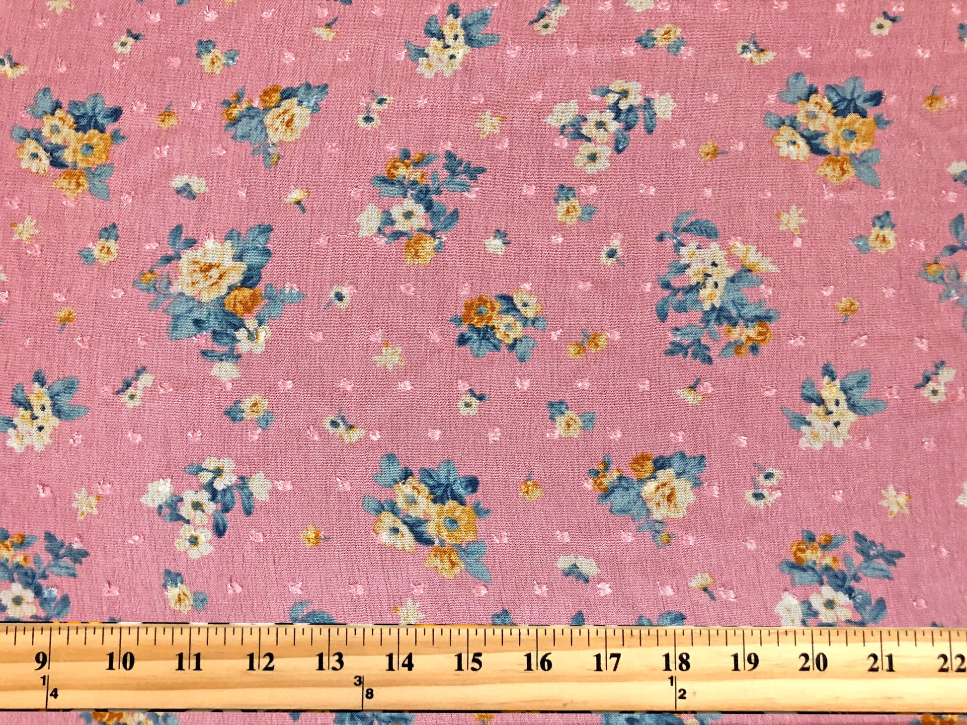 Vibrant Pink Swiss Dot Rayon Gauze with Vanilla/Cream Roses & Teal Leaves — 100% Rayon, 52″ Wide — Fabric by the Yard-(RGZPR014)