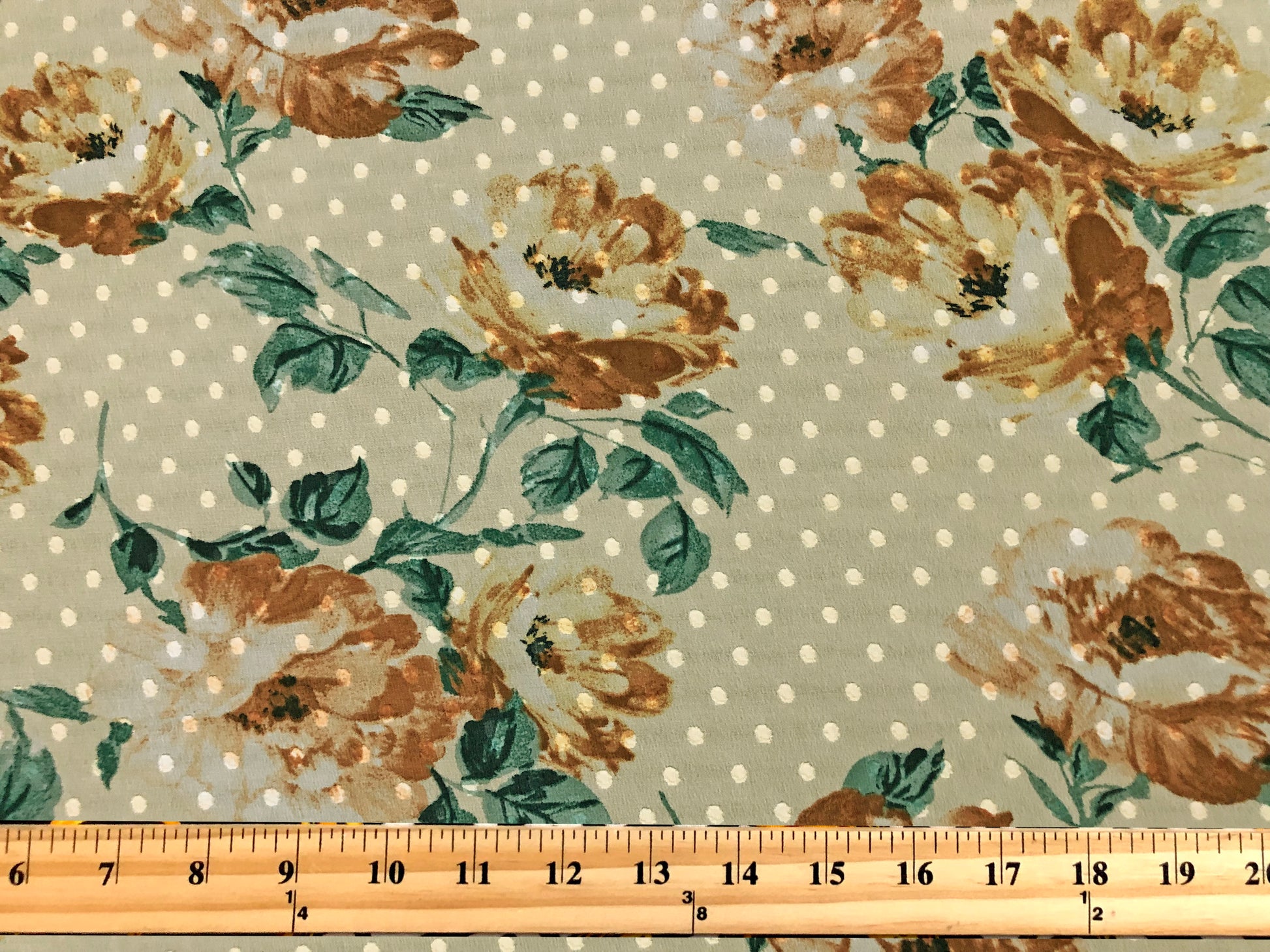 Warm-Sage Swiss-Dot Chiffon with Caramel & Cream Roses — Sheer, 52" Wide, No Stretch — By the Yard (CFPR06)