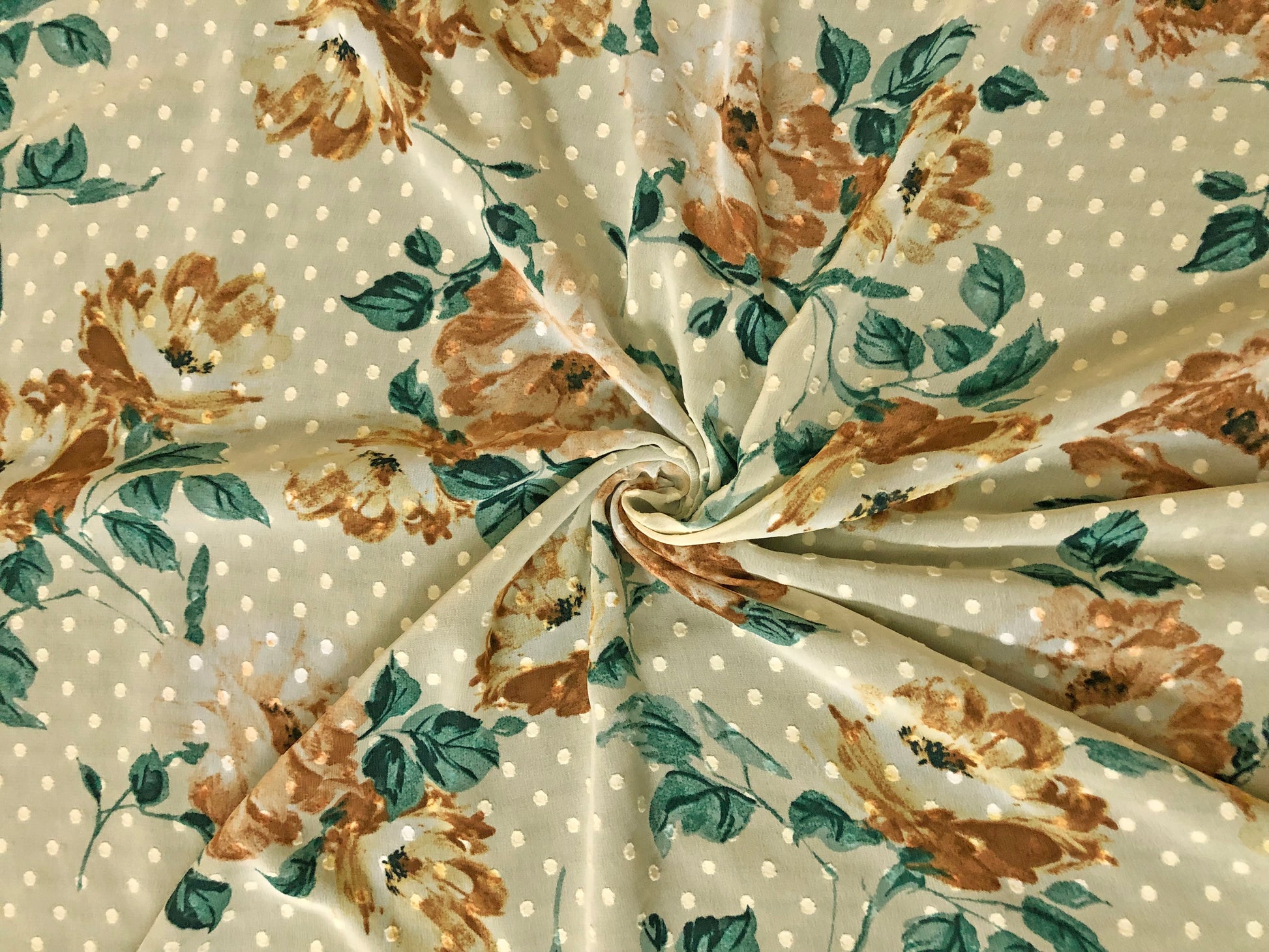 Meet your soft-romantic staple. Sheer, floaty Swiss-dot chiffon on a warm-sage/sage-beige ground, sprinkled with caramel & cream roses and teal leaves. The dotted texture catches the light while the vintage florals stay elegant—so your flutter sleeves, tiered skirts, and overlays look boutique-ready.