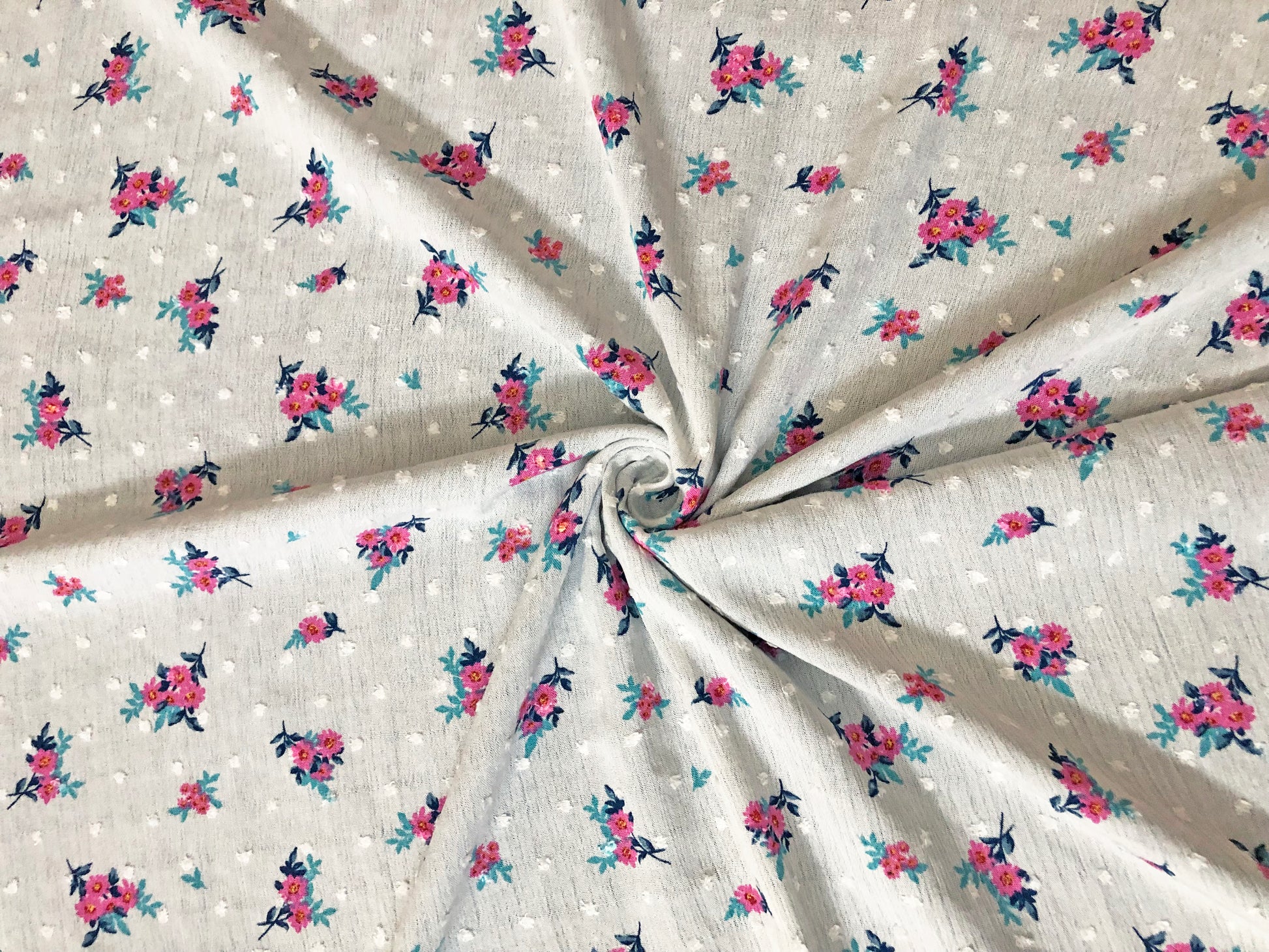 White Swiss Dot Rayon Gauze with Pink/Teal Ditsy Florals — 100% Rayon, 52″ Wide — Fabric by the Yard (RGzPR03)