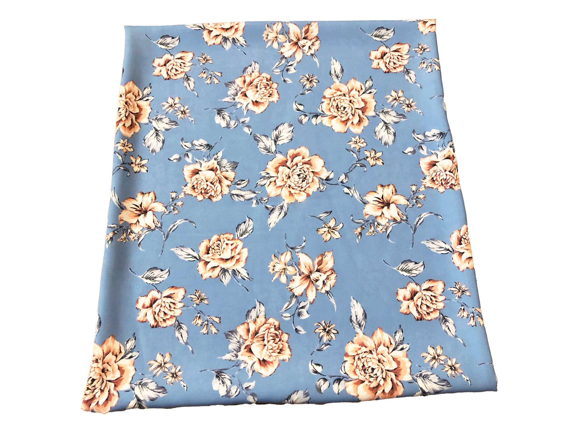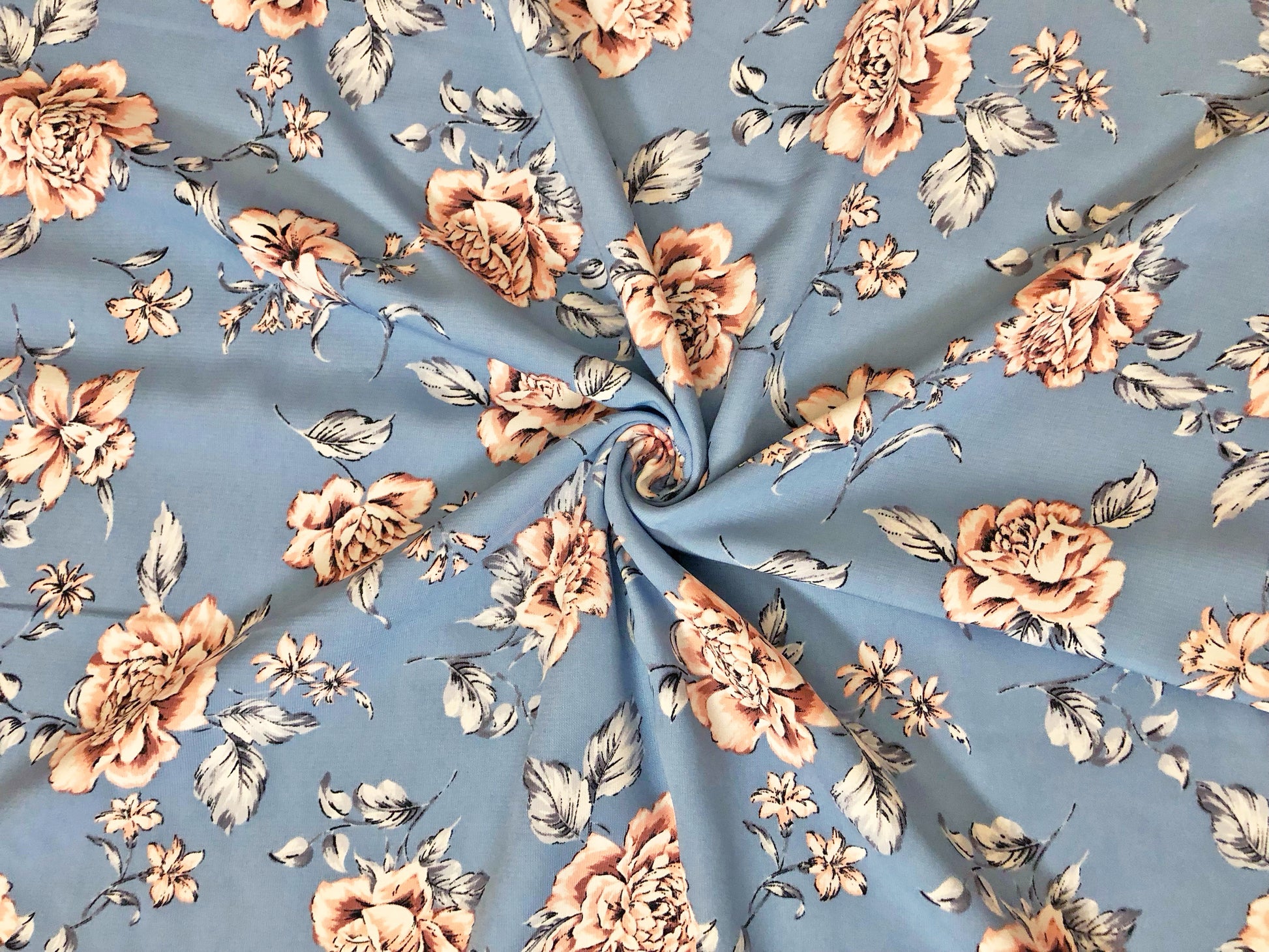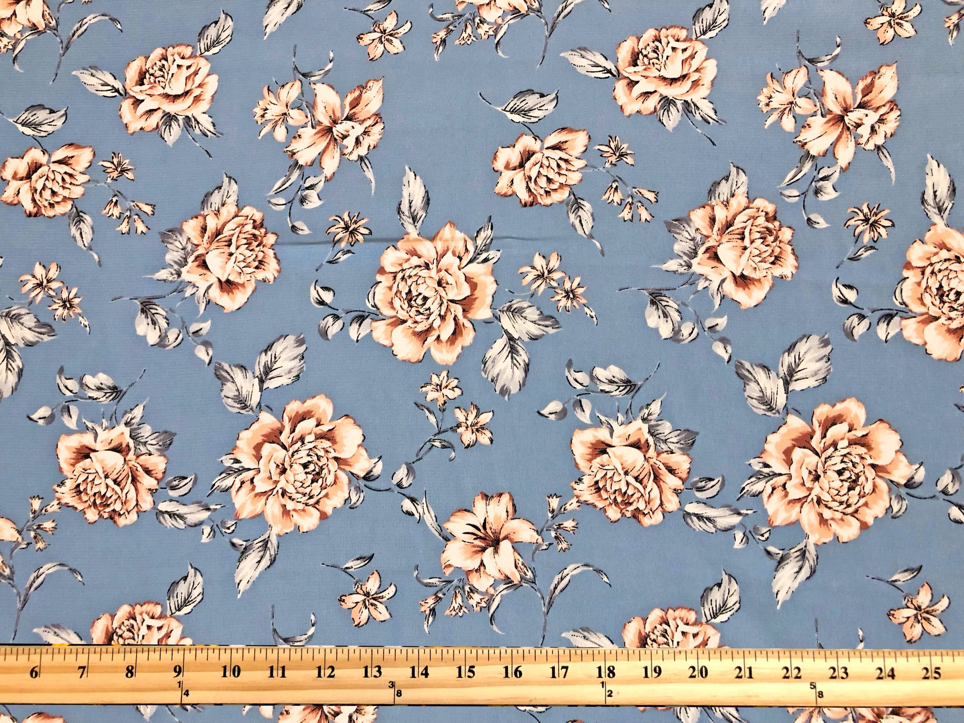 Romantic florals meet silky drape in our Bluebell Blush Rose wool peach on a dusty blue ground. Soft feel and matte finish make it perfect for flowy dresses, blouses, skirts, kimonos, linings, and costume pieces—easy care and always polished.